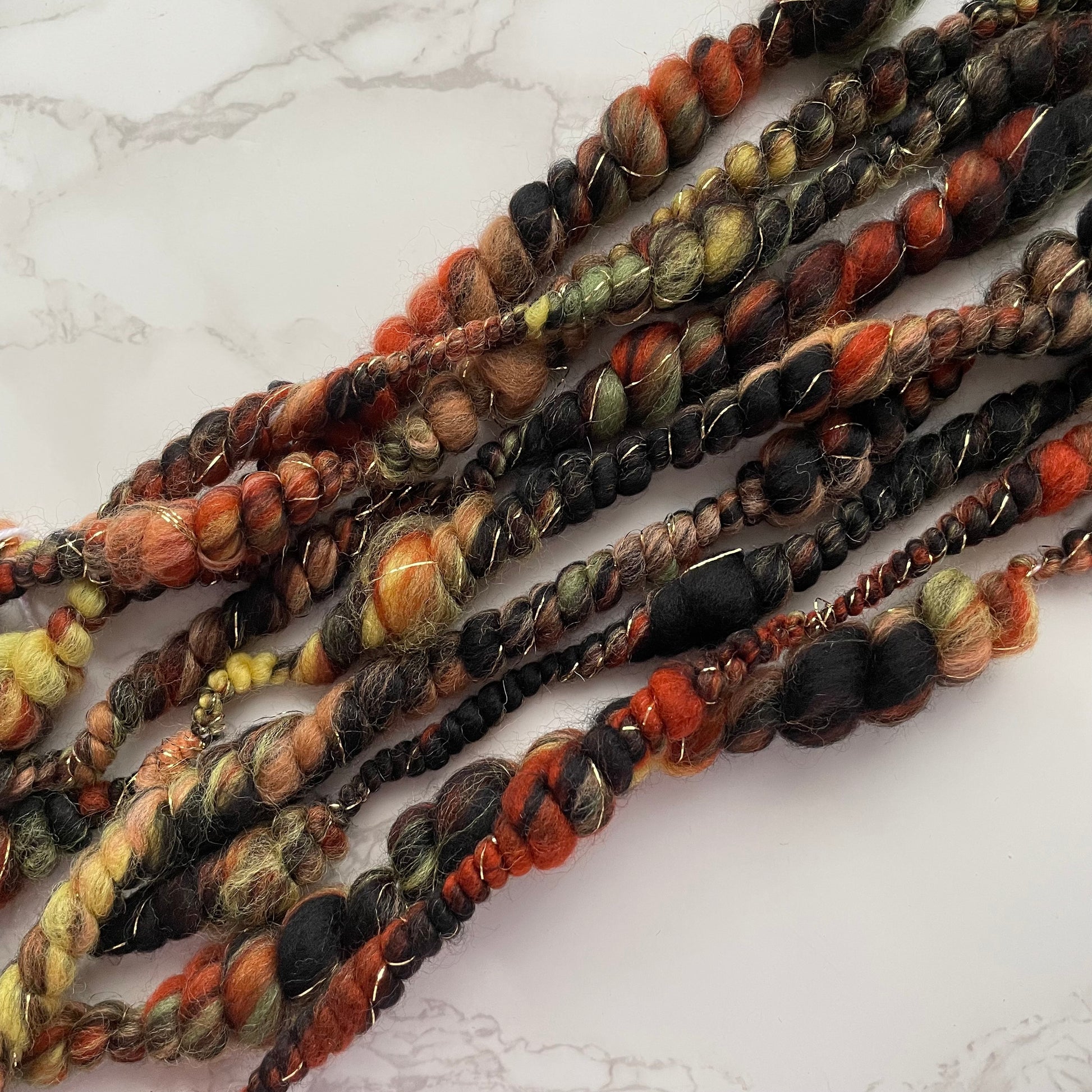 This skein is 55g in weight and approximately 5 yards in length. The fibres have been blended by myself, hand spun on my spinning wheel and then steam set. This yarn is made from mulesing-free merino and metallic thread.