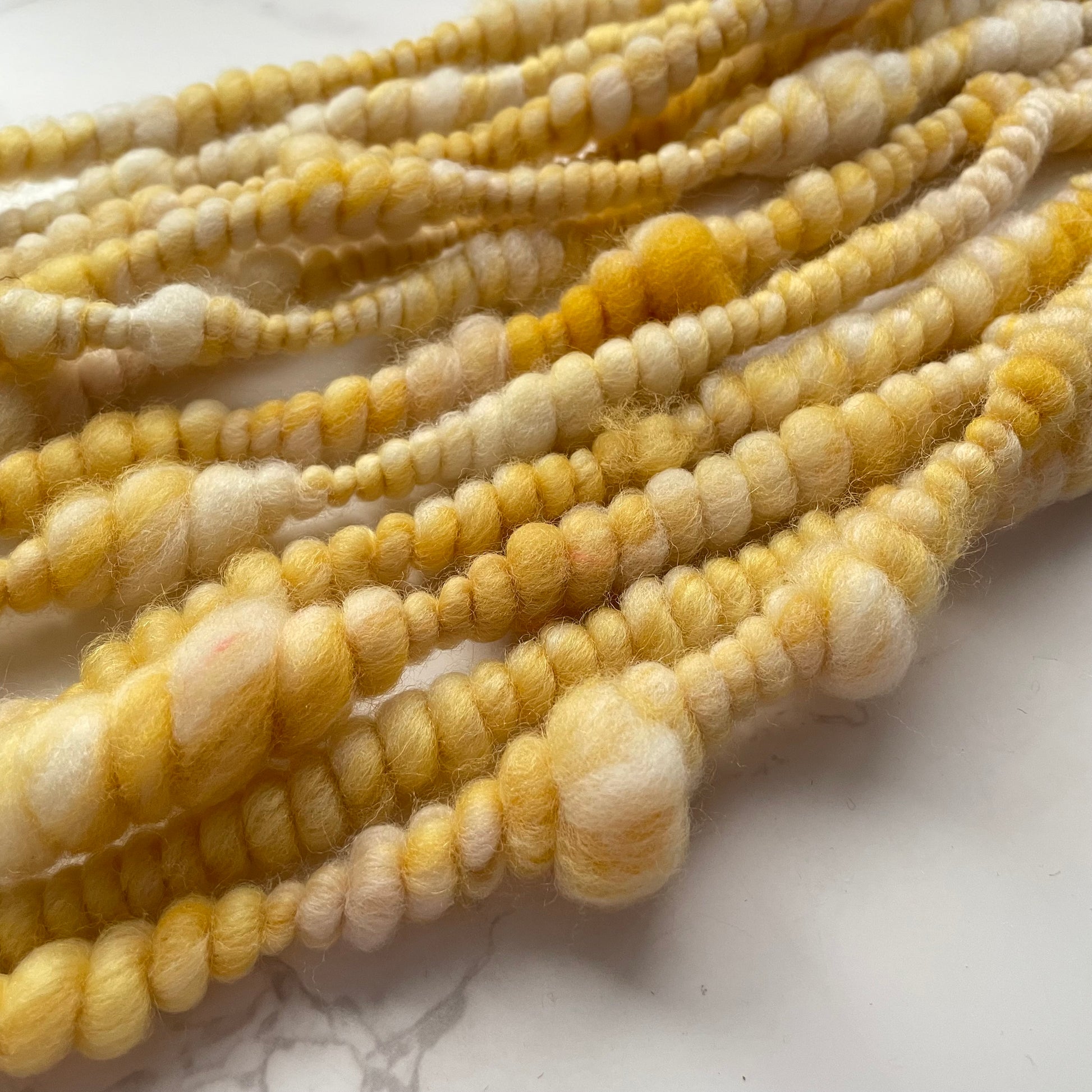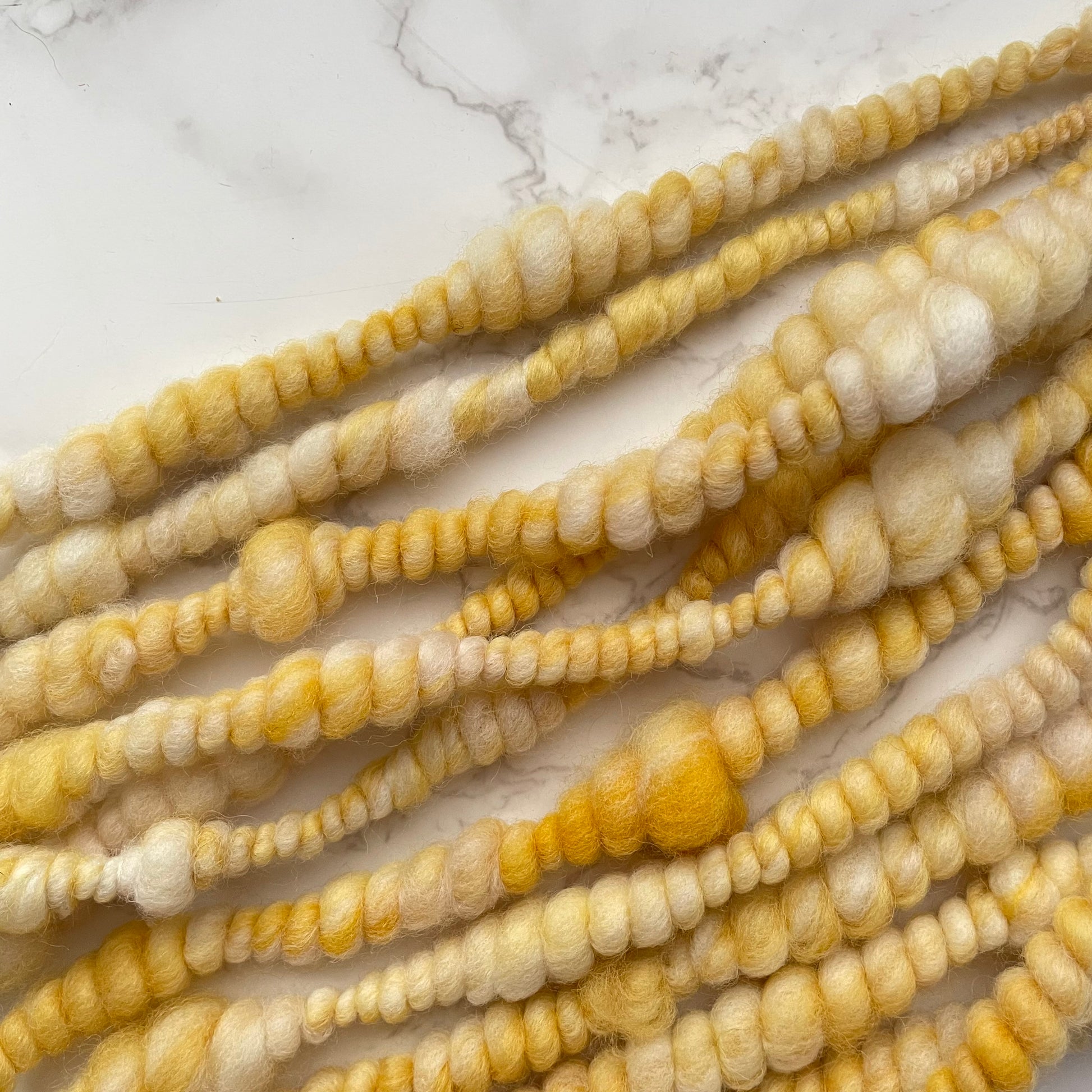 This skein is 61g in weight and approximately 6 yards in length. The fibres have been blended by myself, hand spun on my spinning wheel and then steam set. This yarn is made from mulling-free merino.