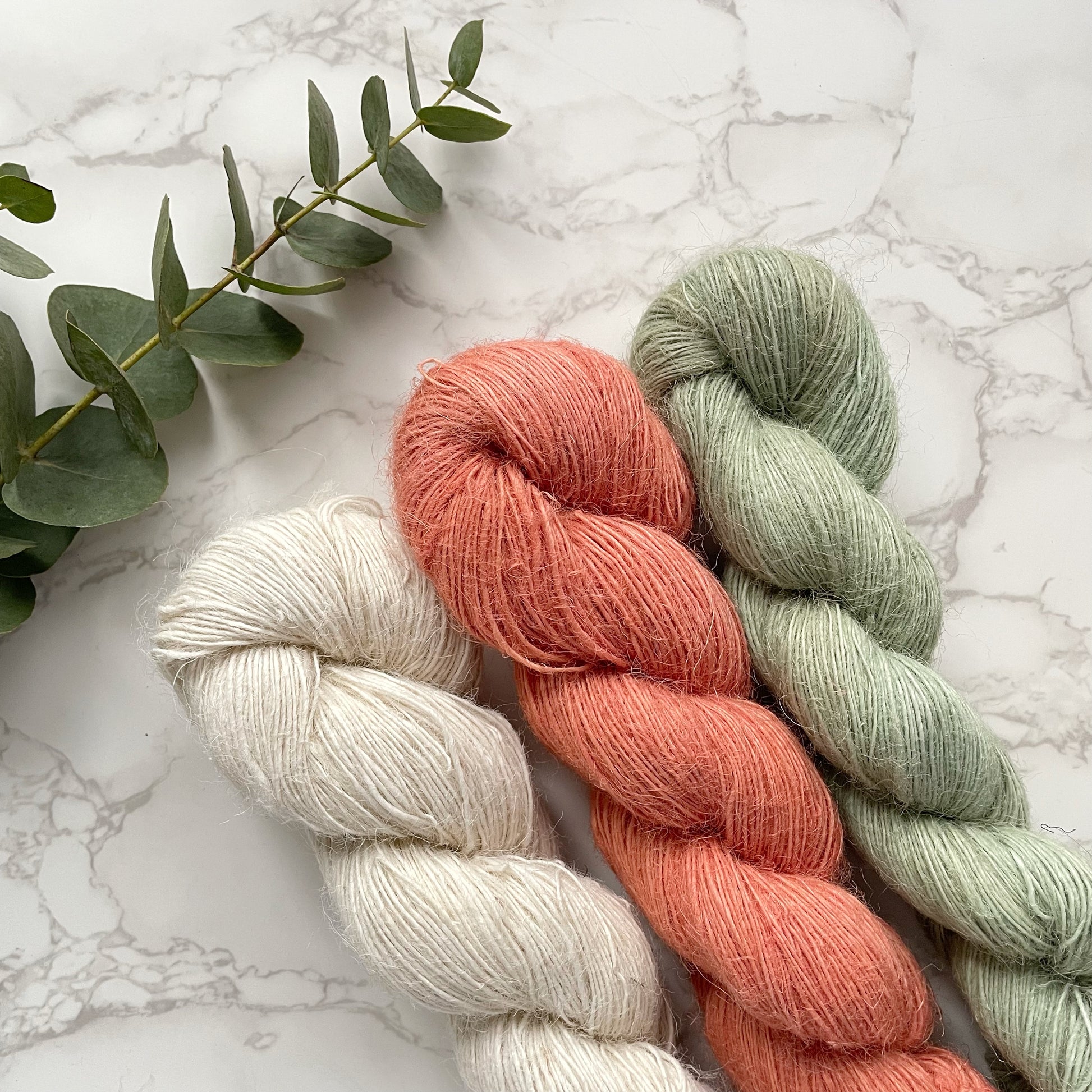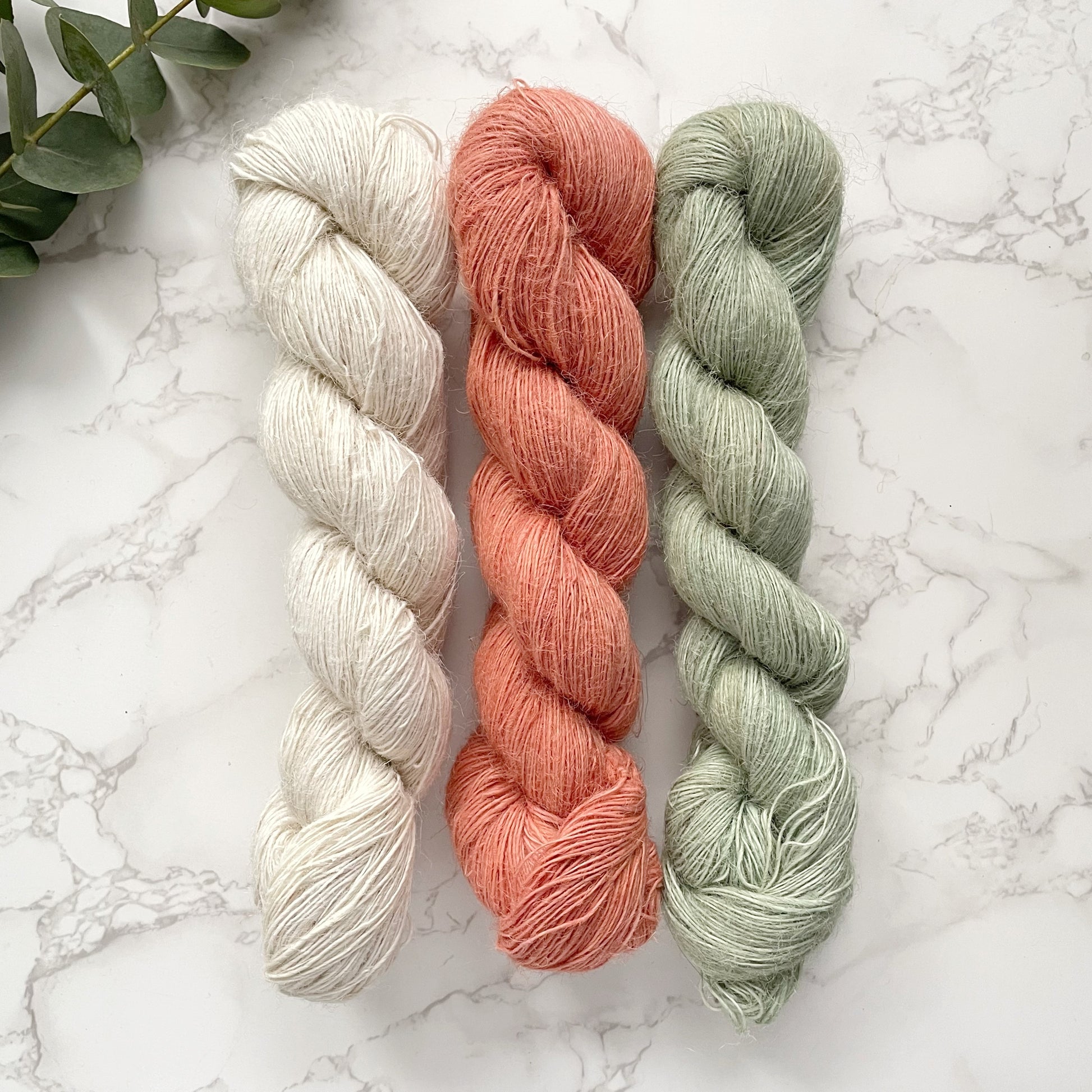 Each skein is approximately 100g in weight, with approximately 200 meters in length. Currently available in 3 tactile, complimentary colours: Natural/off-white, Tuscan Terracotta & Green Tea
