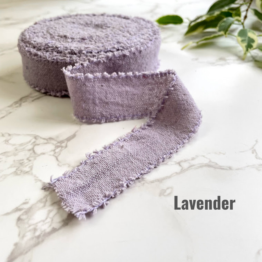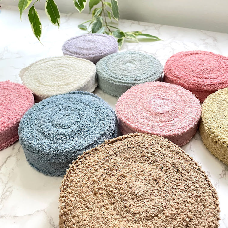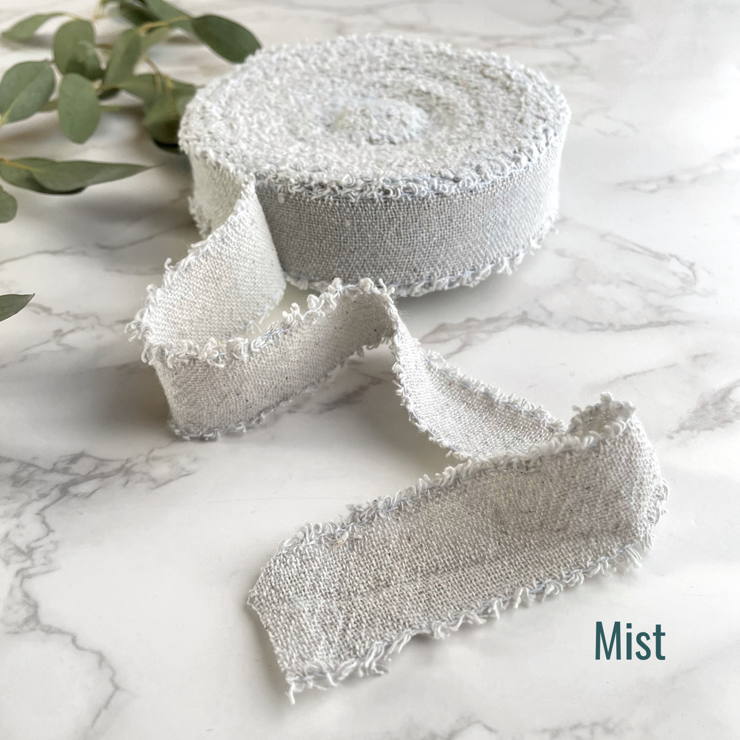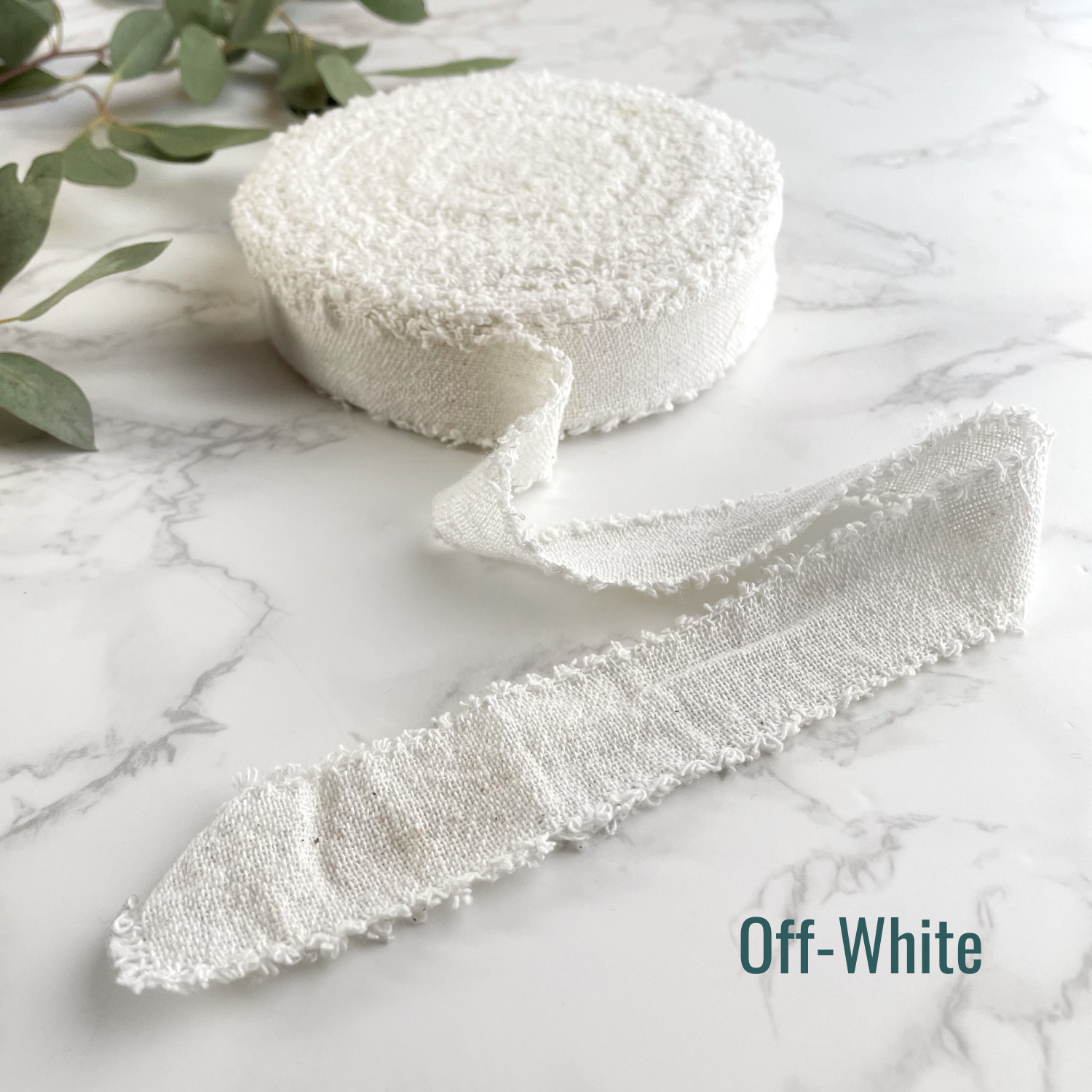These ribbon bundles are made of 100% recycled cotton. The fabric has been handwoven and has slightly frayed edges that have been stitched to prevent further fraying. The ribbon is approximately 1inch in width. Such a unique ribbon with so much potential!