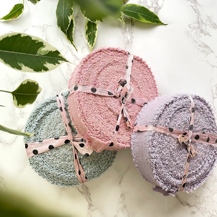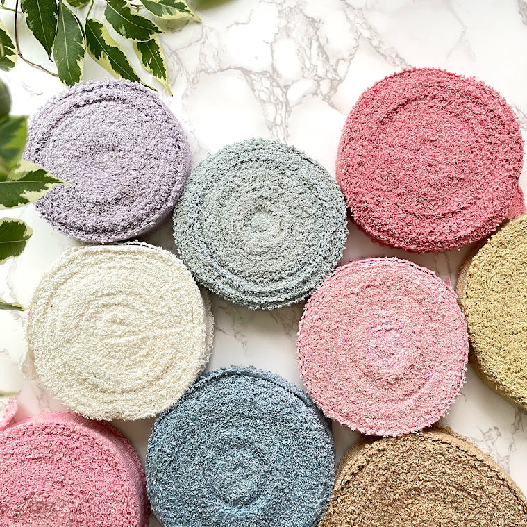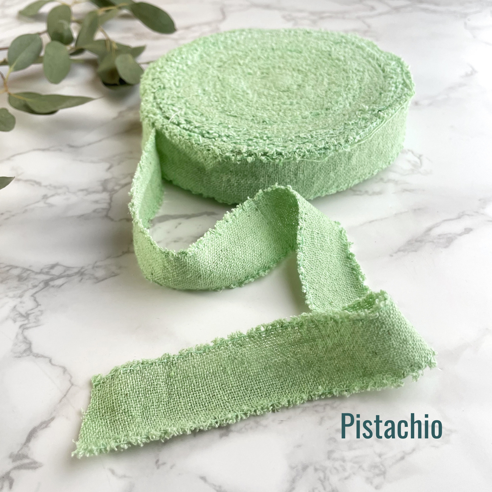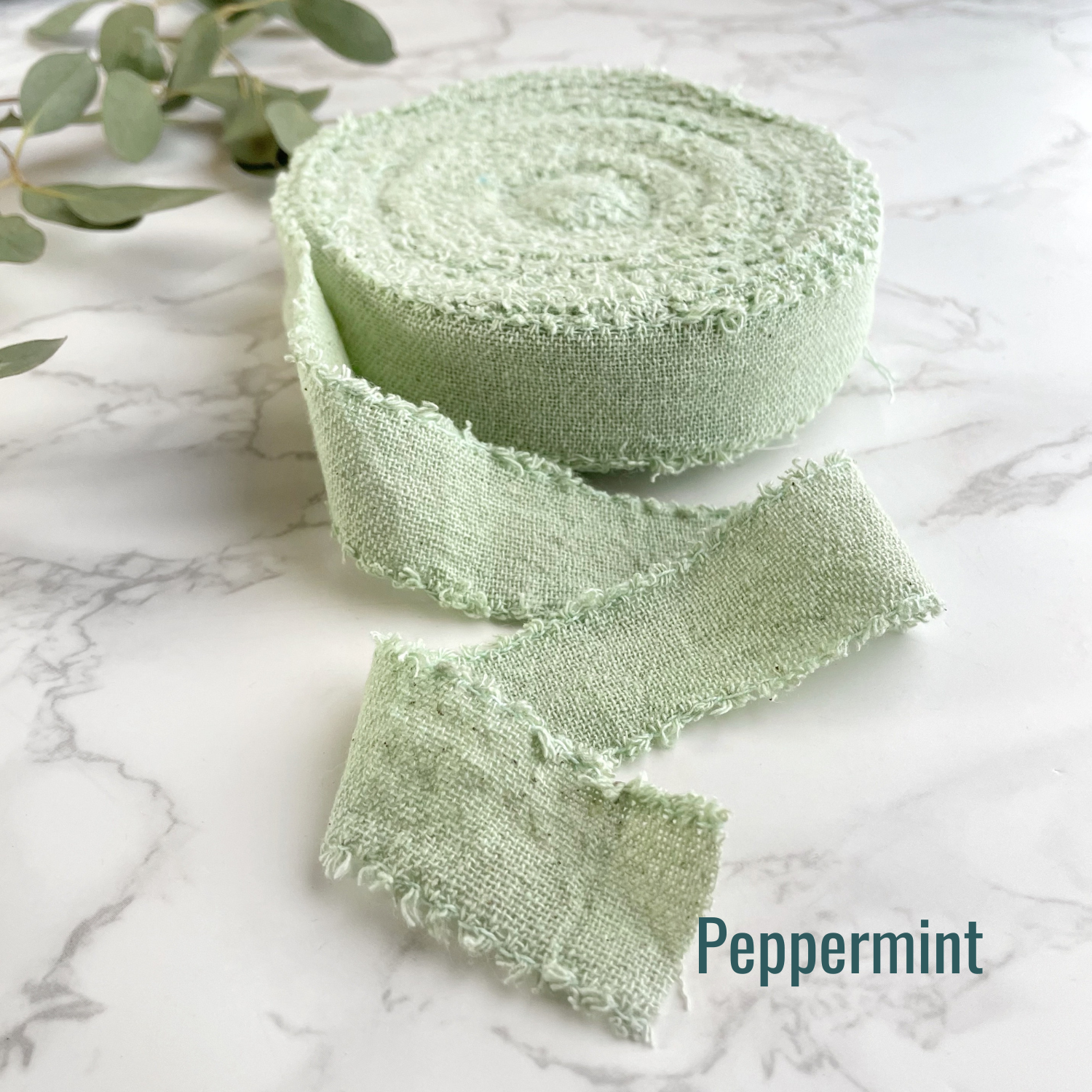 These ribbon bundles are made of 100% recycled cotton. The fabric has been handwoven and has slightly frayed edges that have been stitched to prevent further fraying. The ribbon is approximately 1inch in width. Such a unique ribbon with so much potential!