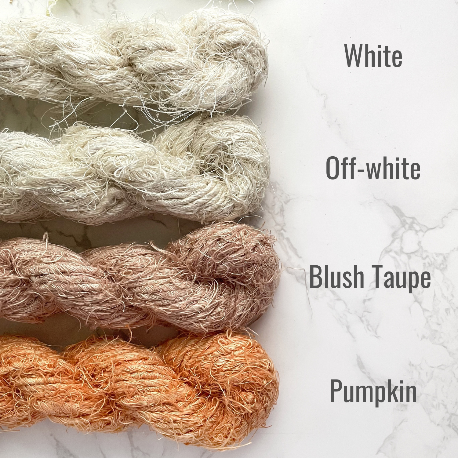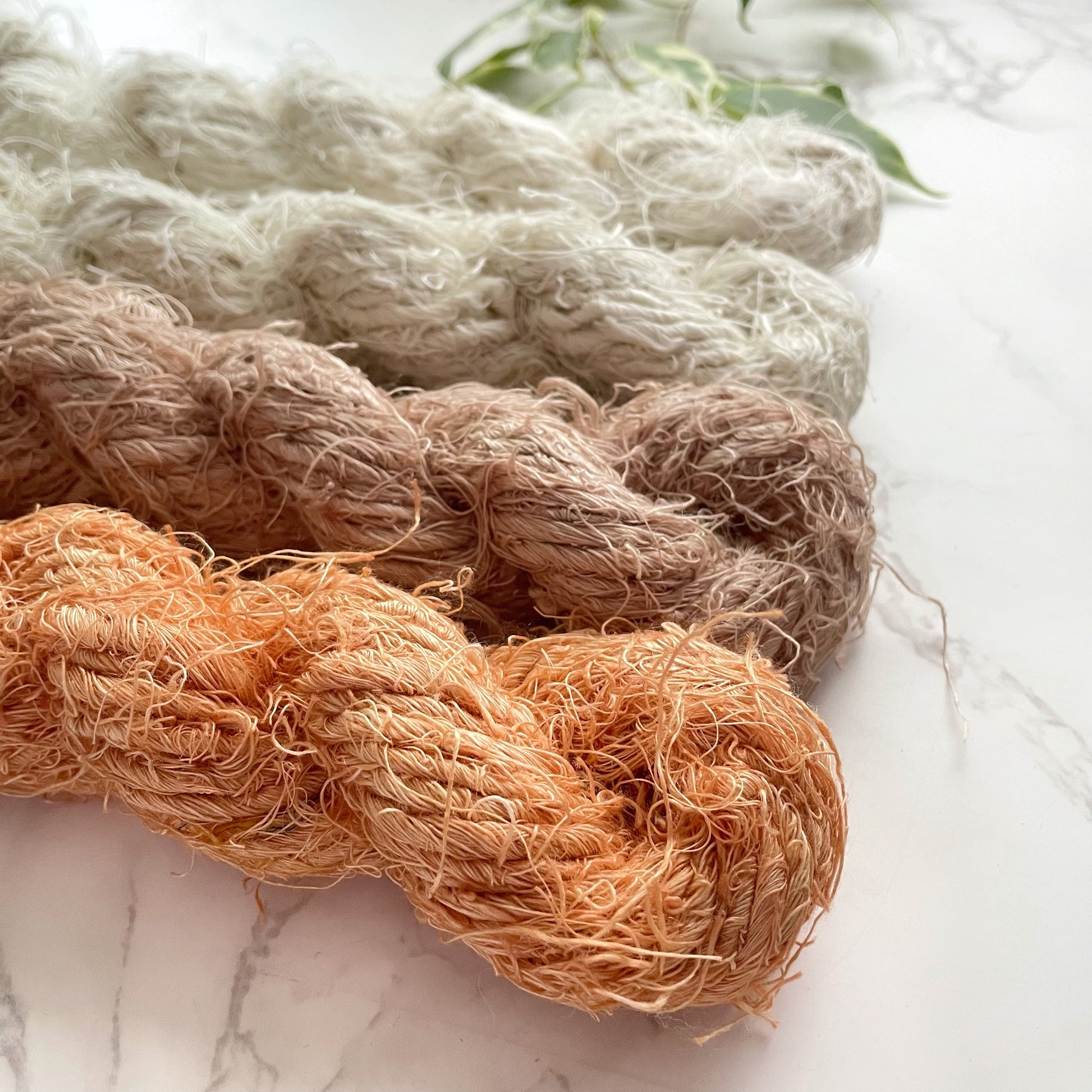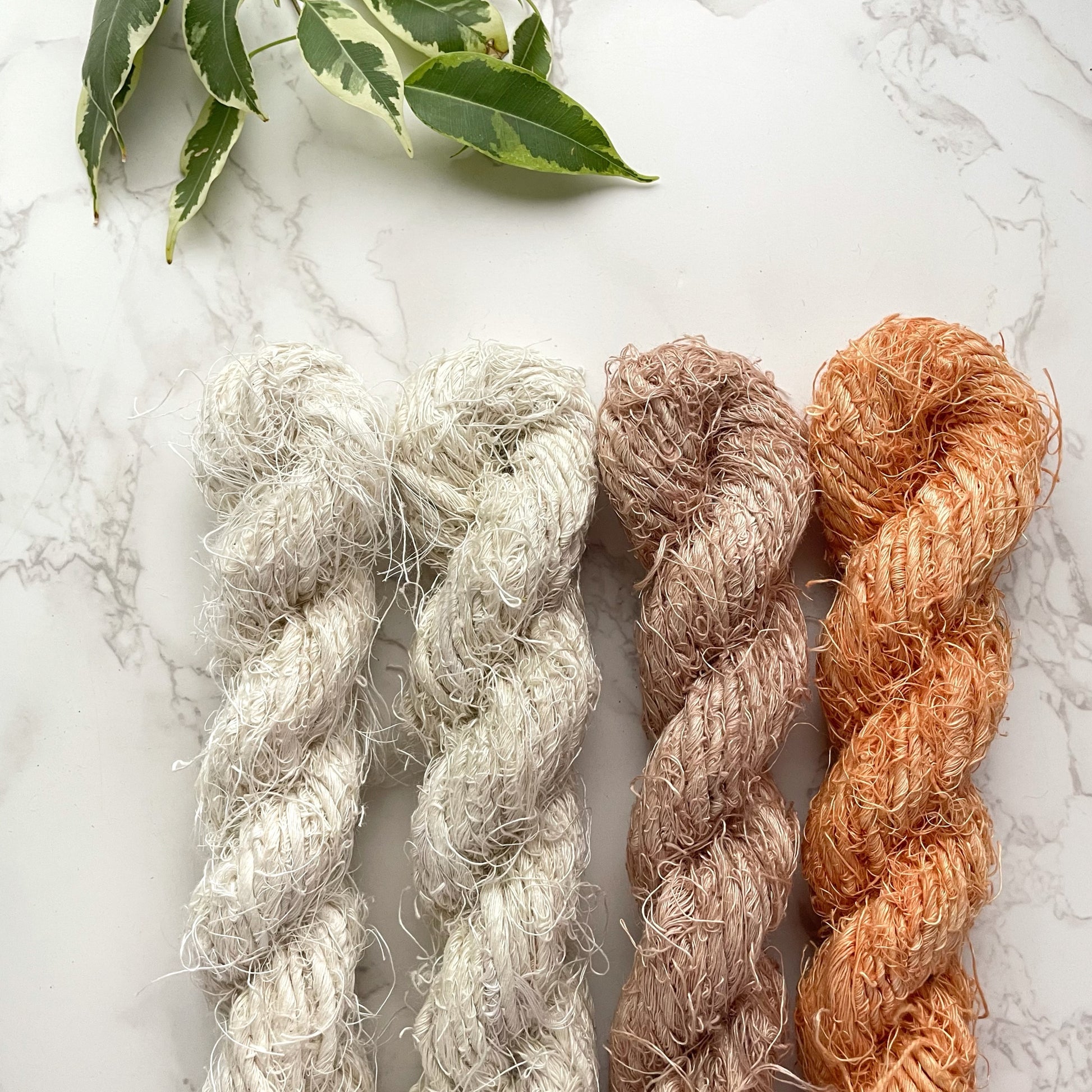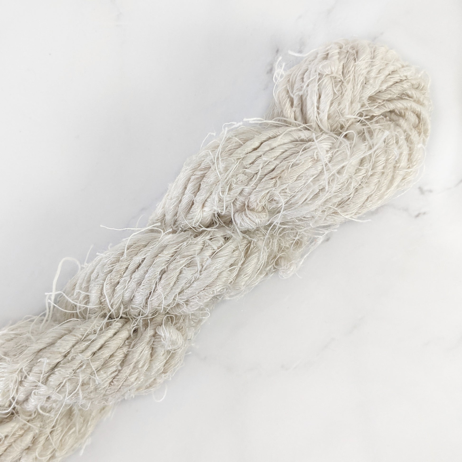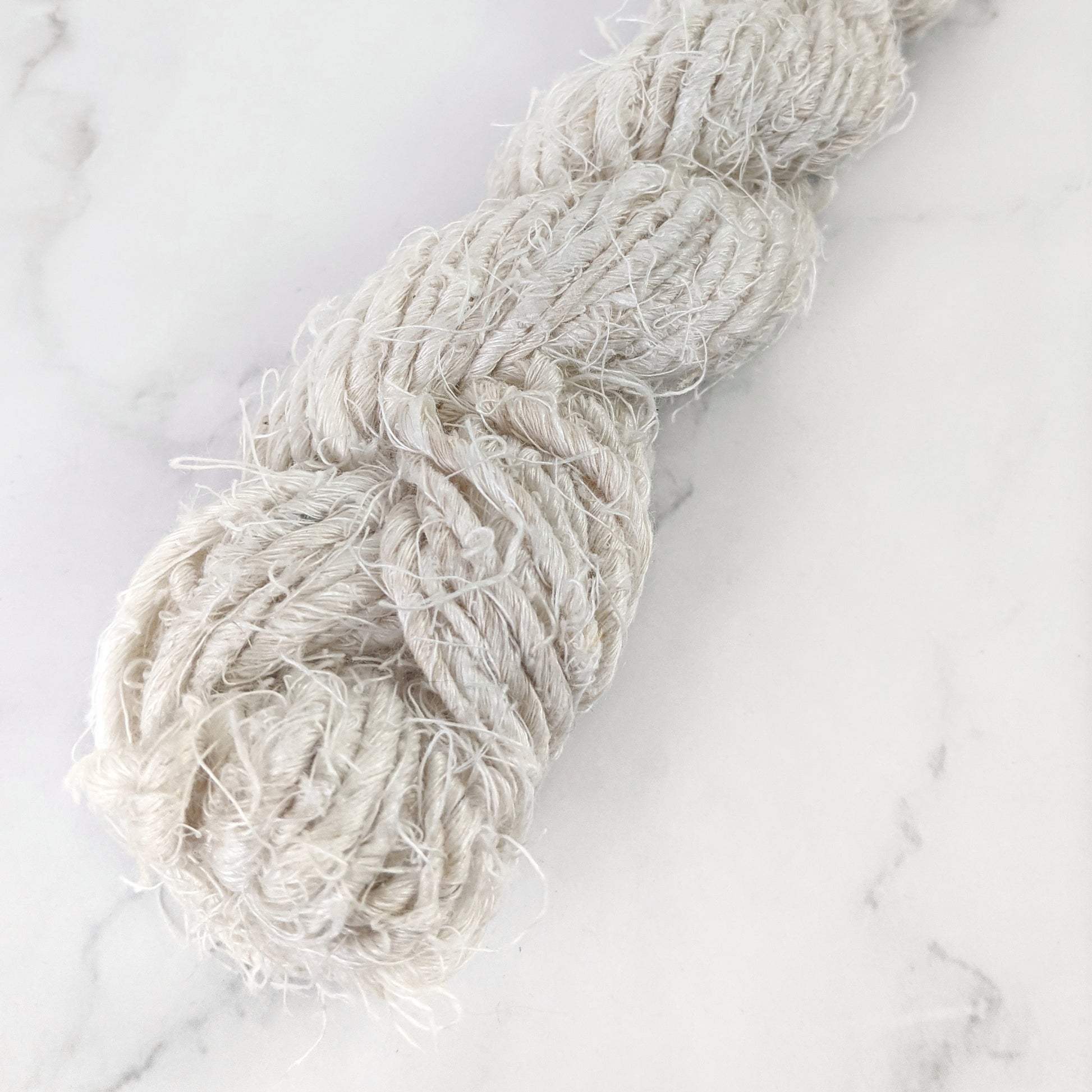 This yarn is hand spun from recycled linen waste, giving incredible frizzy texture. This yarn has a slightly similar sheen to banana yarn, but with added frizz! Super fun and eco-friendly!