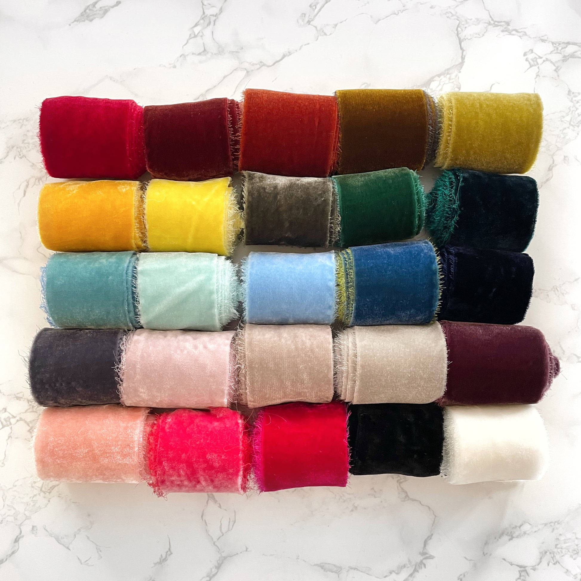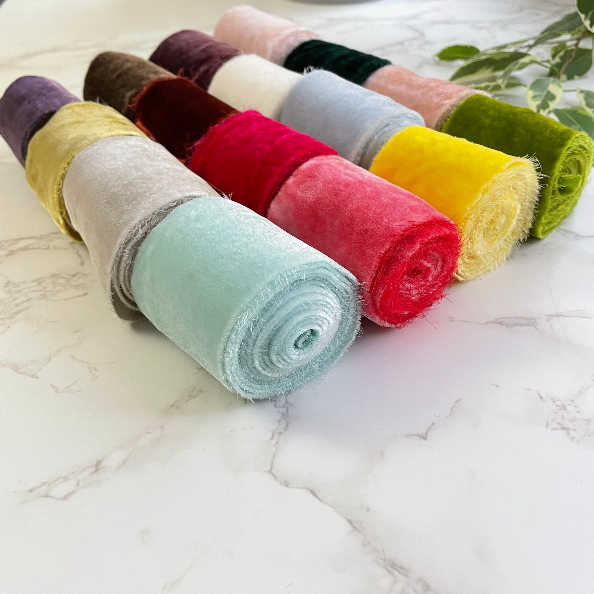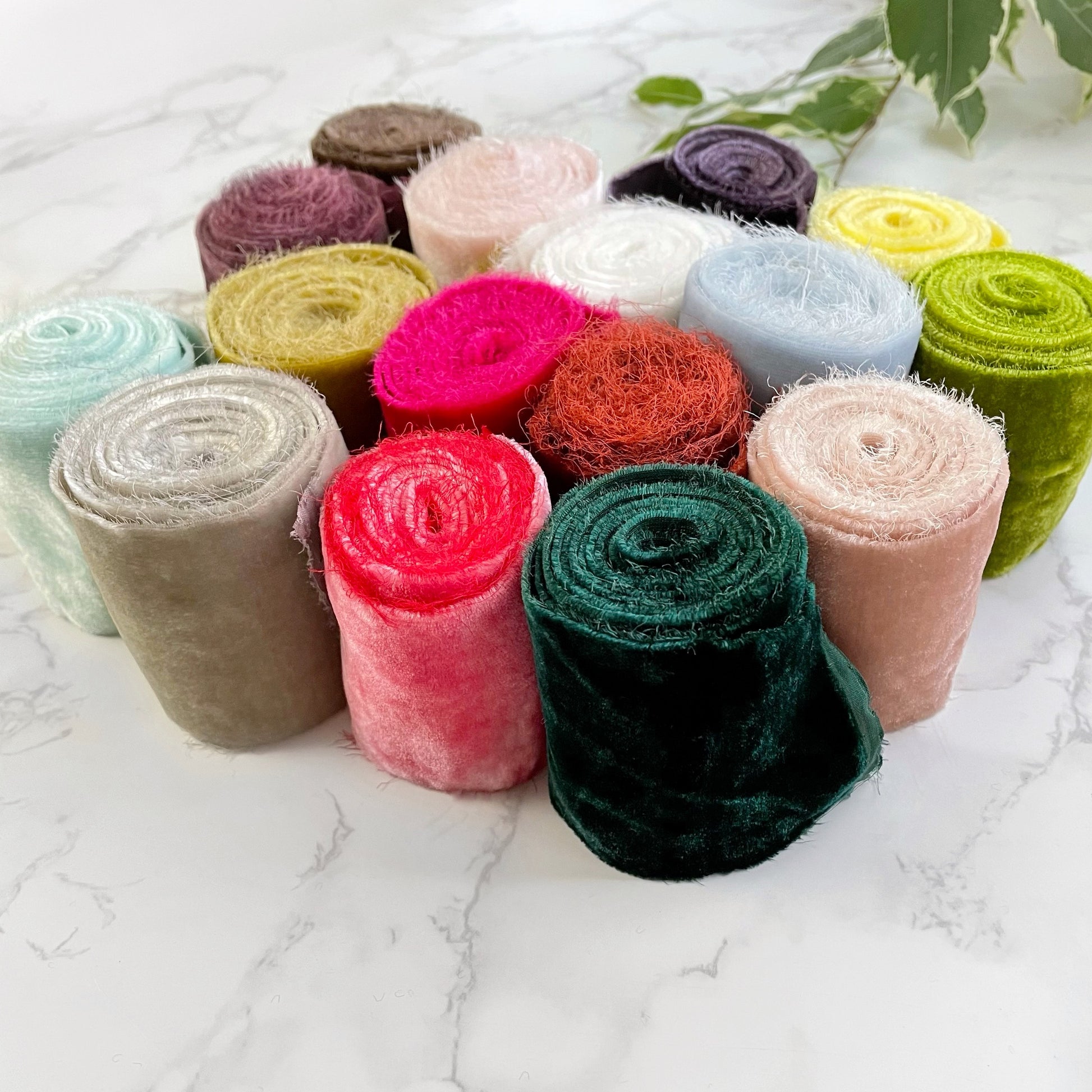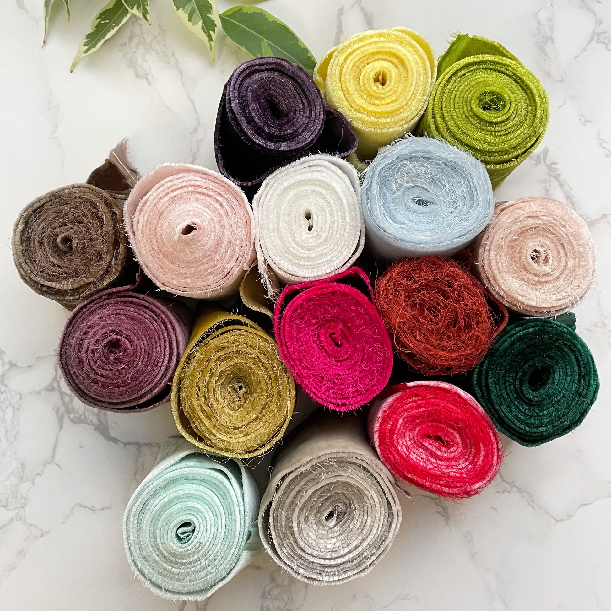 This silk velvet fabric has been carefully hand-torn into ribbons for decorative use and then steamed for their luxurious, immaculate appearance. They've been put together for use in Fibre Arts, but are of course not exclusively for fibre arts at all! They have lots of other uses - for bouquets, Christmas wreaths, gift wrapping and much more! They're a silk/viscose blend.