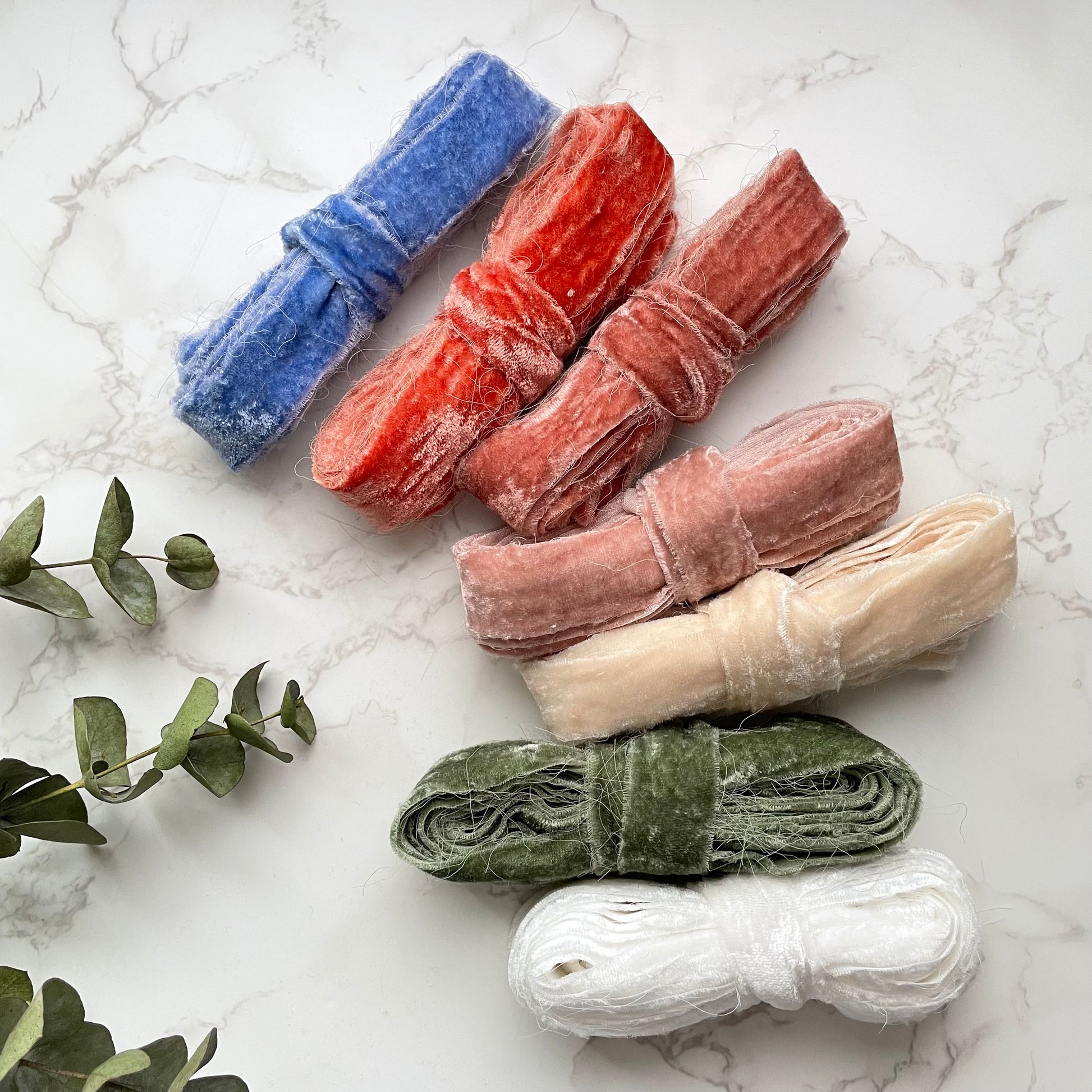 This velvet fabric is cut into ribbons for decorative use. These are perfect for weaving, but are of course not exclusively for fibre arts - they have lots of other uses!