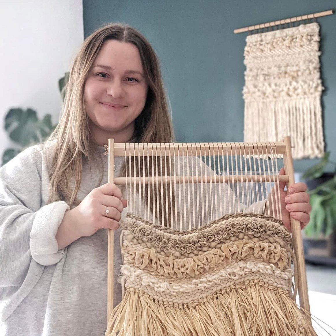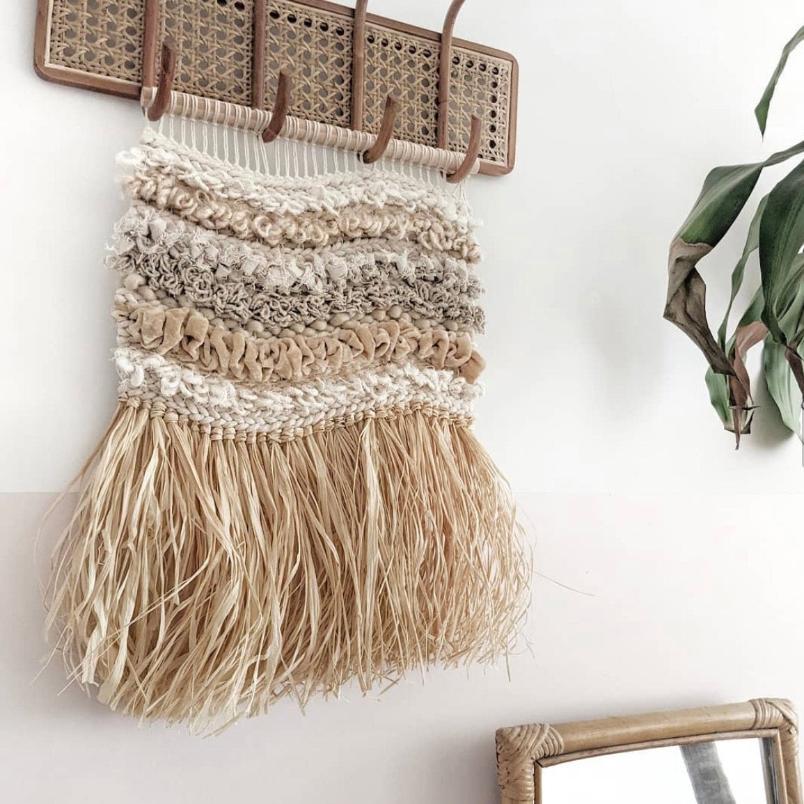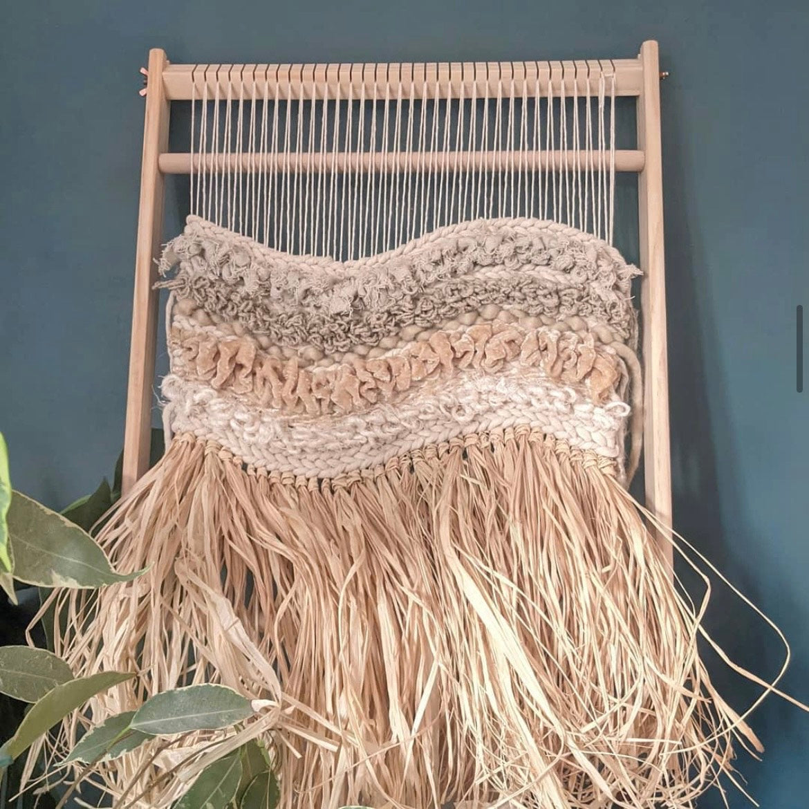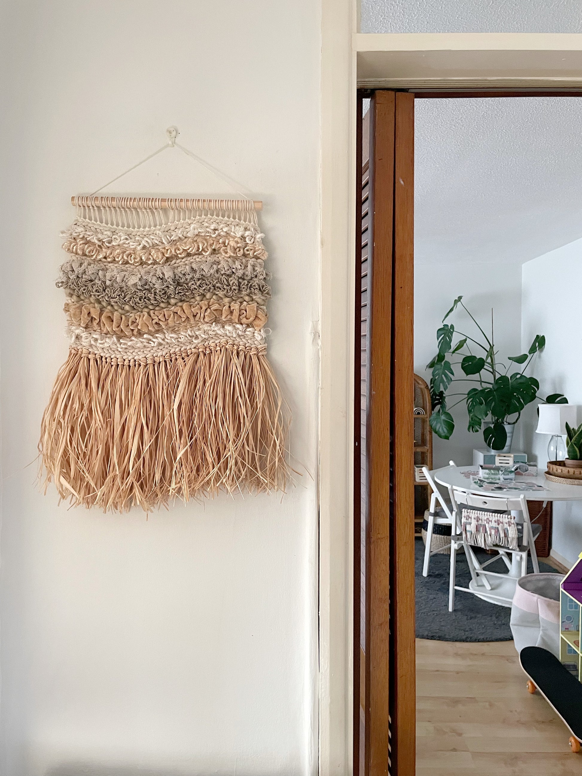 This wall hanging has handwoven, on a weaving loom. There's an abundance of high quality, beautiful fibres woven into this piece - linen yarn, cotton string, banana yarn, raffia, velvet ribbon, felted merino yarn and recycled cotton frizz ribbon!