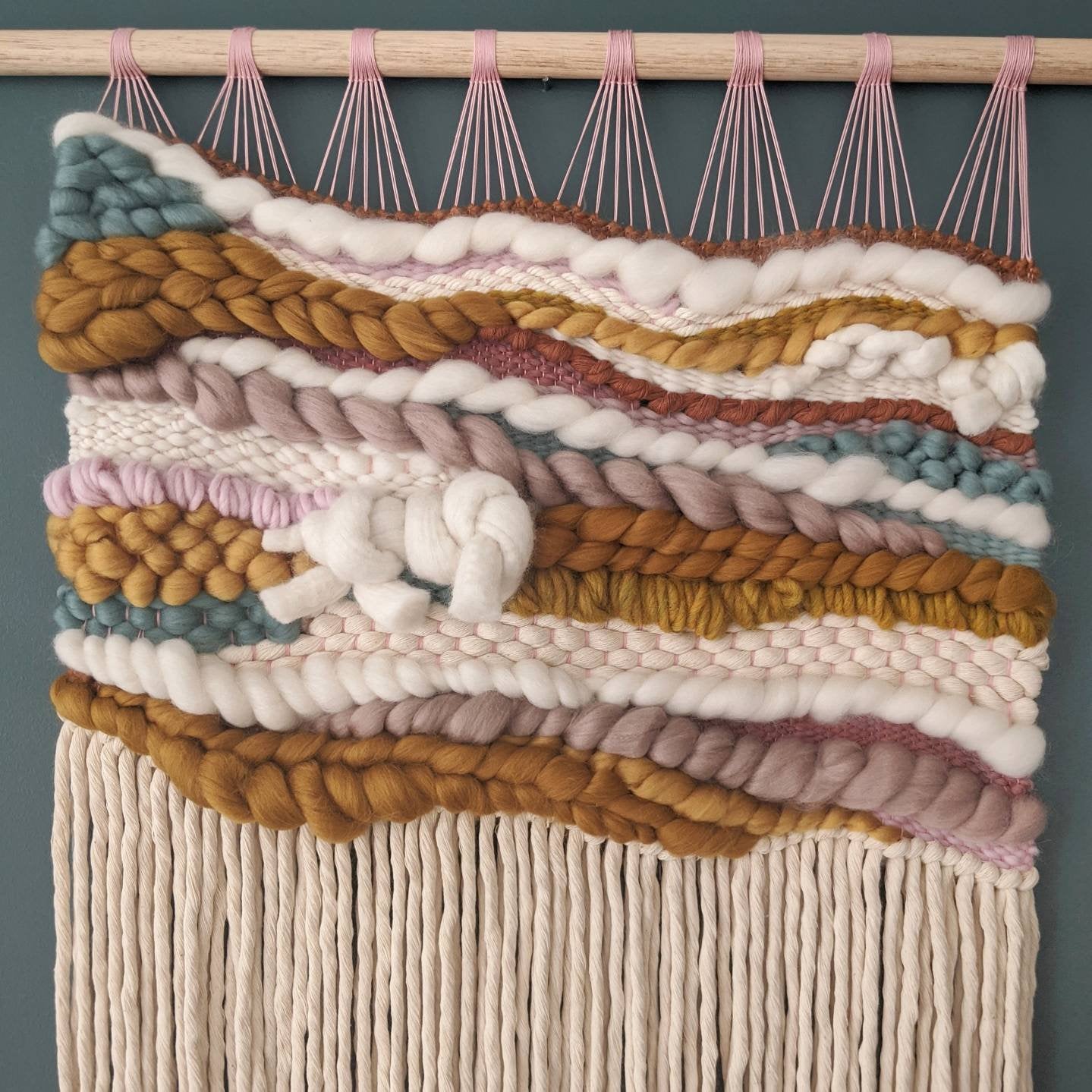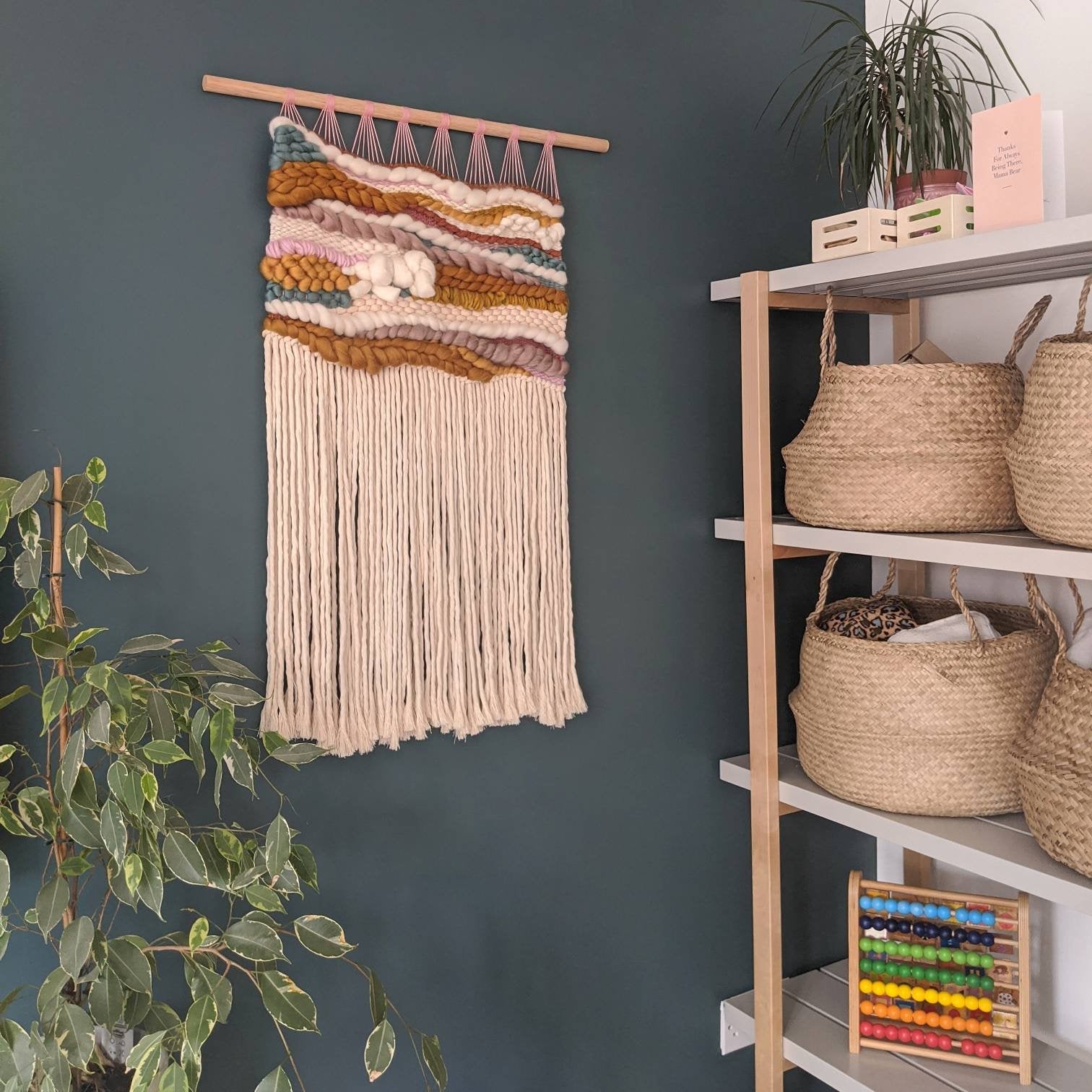 This wall hanging was handwoven using a weaving loom. It's 60cm in width and 80cm in length from the wooden dowel to the bottom of the fringe.