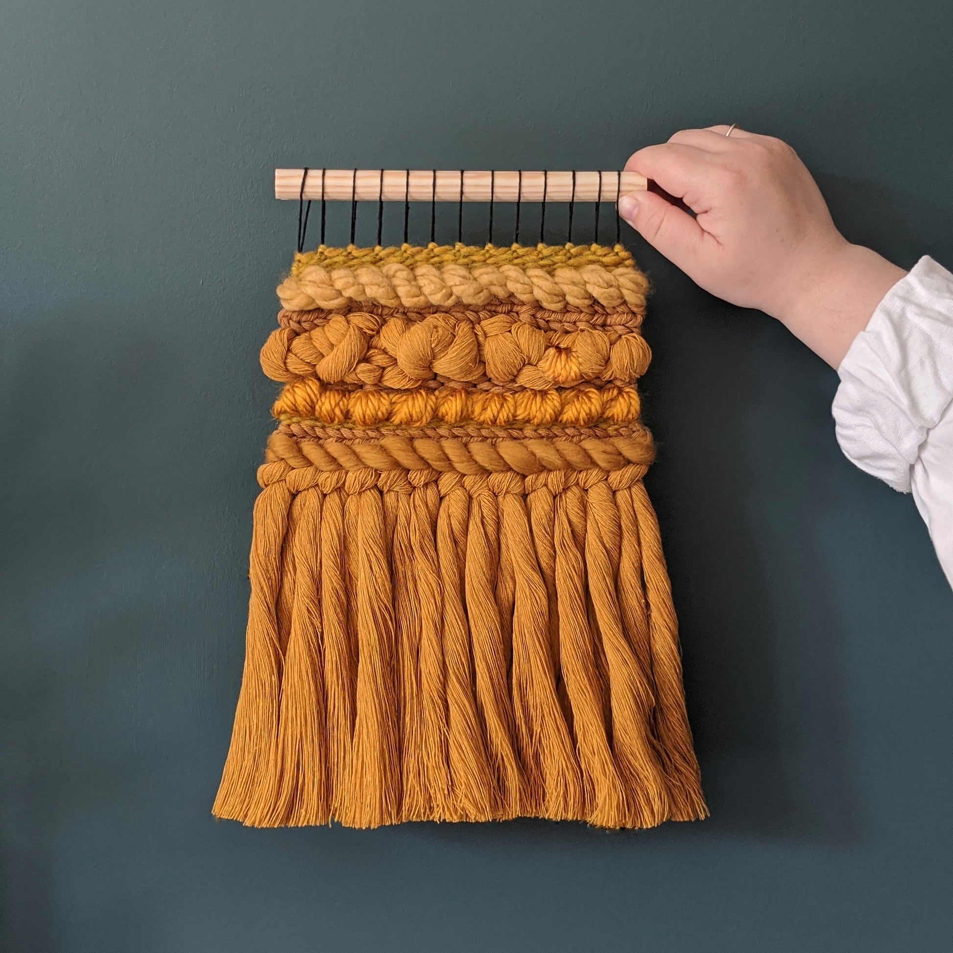 This mustard/burnt orange wall hanging was handwoven using a weaving loom.