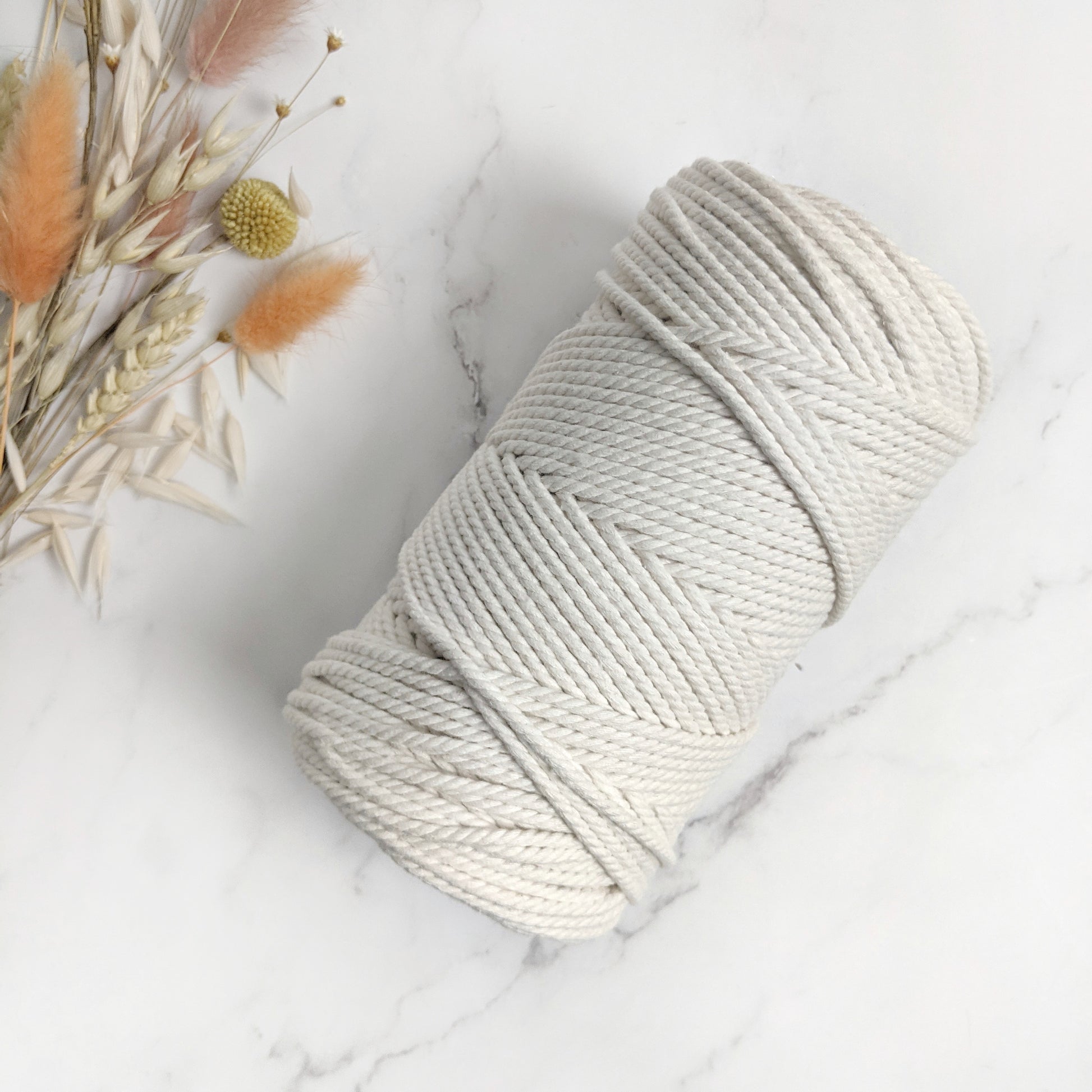 Natural cotton 3ply rope, with a 3mm diameter. Perfect for macramé and weaving, when unraveled gives a beautiful wavy fringe! Also wonderful for lots of other fibre related crafts and gift wrapping/tying! 0.4-0.5kg is approximately 85m in length.