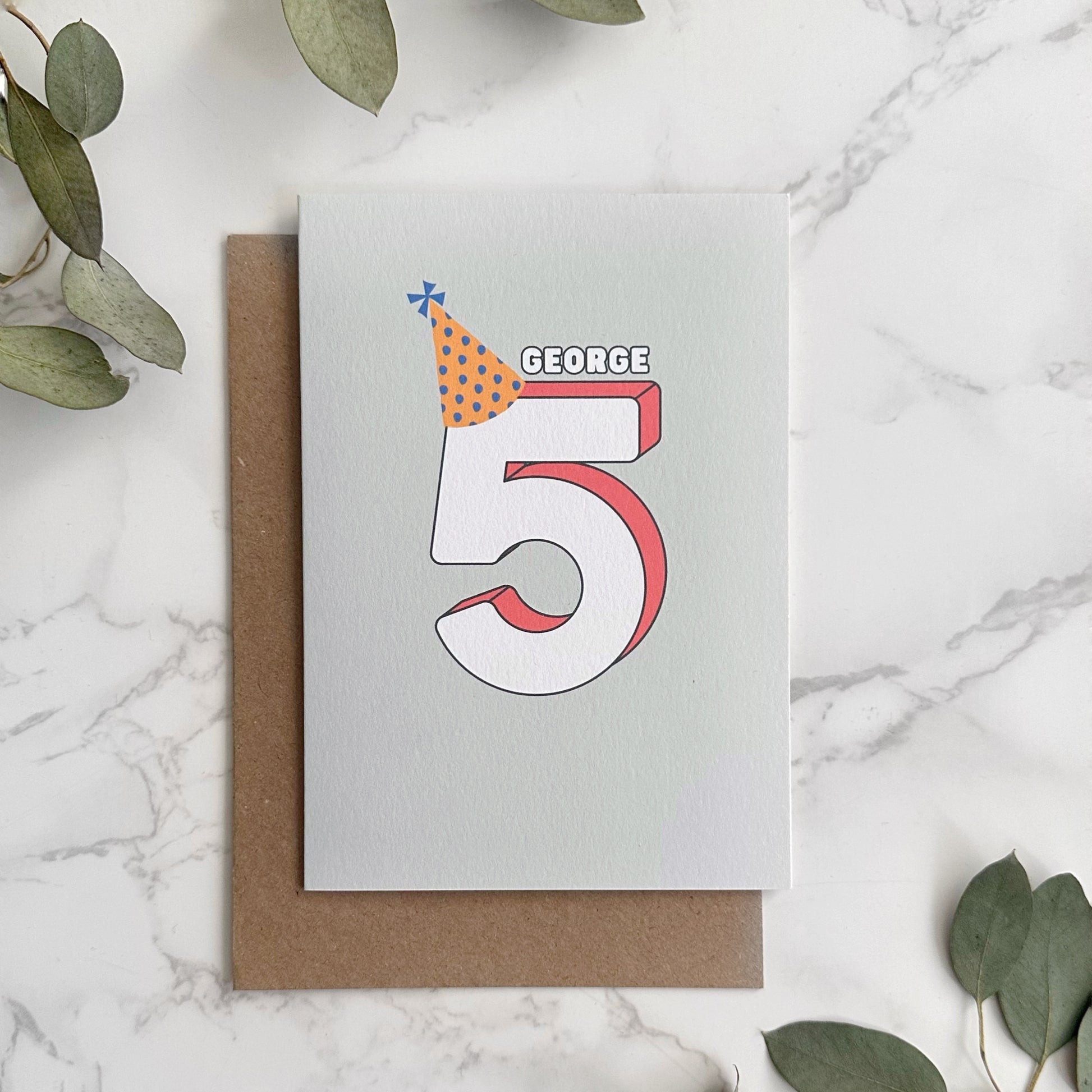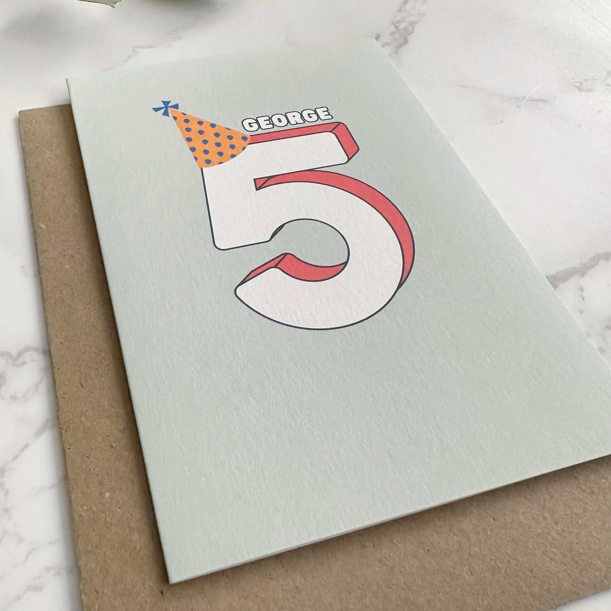 These can be personalised with a name, as seen in the 5th birthday card in the lisiting photos. If you would like the personalisation with a name, please include a note when ordering with the name you'd like on the card. Please note that positioning of the name on the card design will vary, dependant on the length of the name and the age number on the card. Sometimes the name will be curved around the number and sometimes straight along the top or side of the number.
