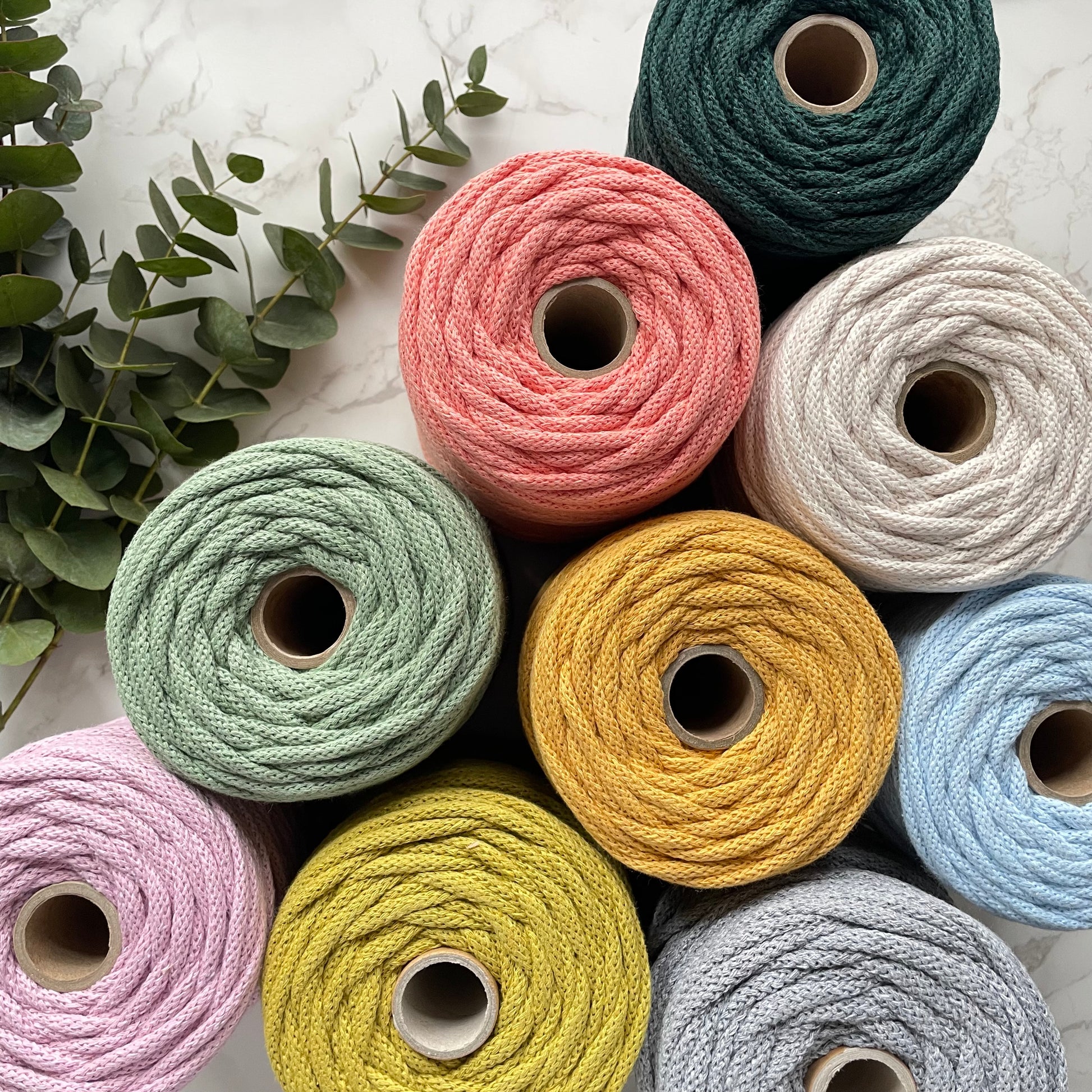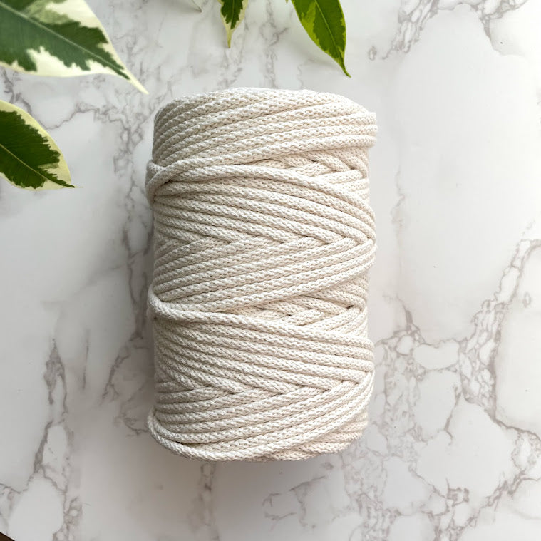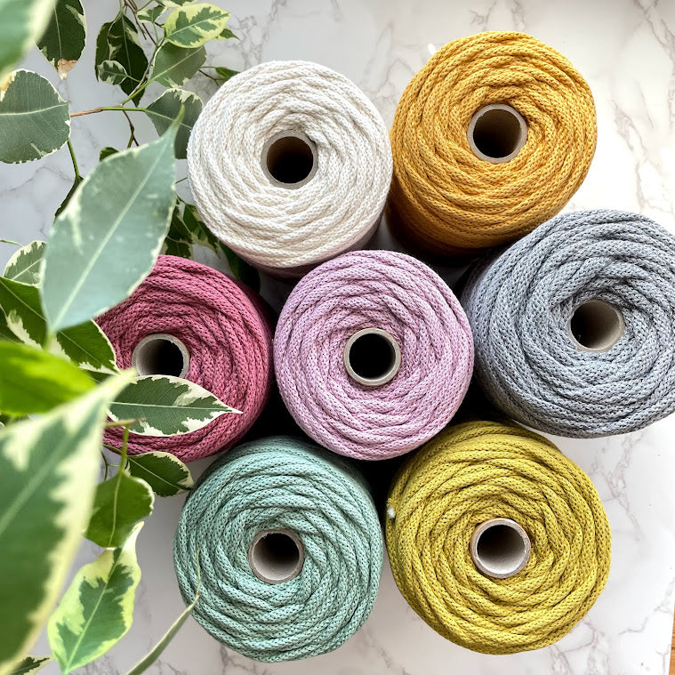 100% recycled cotton, braided cord with a 5mm diameter - perfect for macrame crafts, as well as weaving and wrapping those hoops for warping! 100m is approximately 0.5-0.6kg of cord.