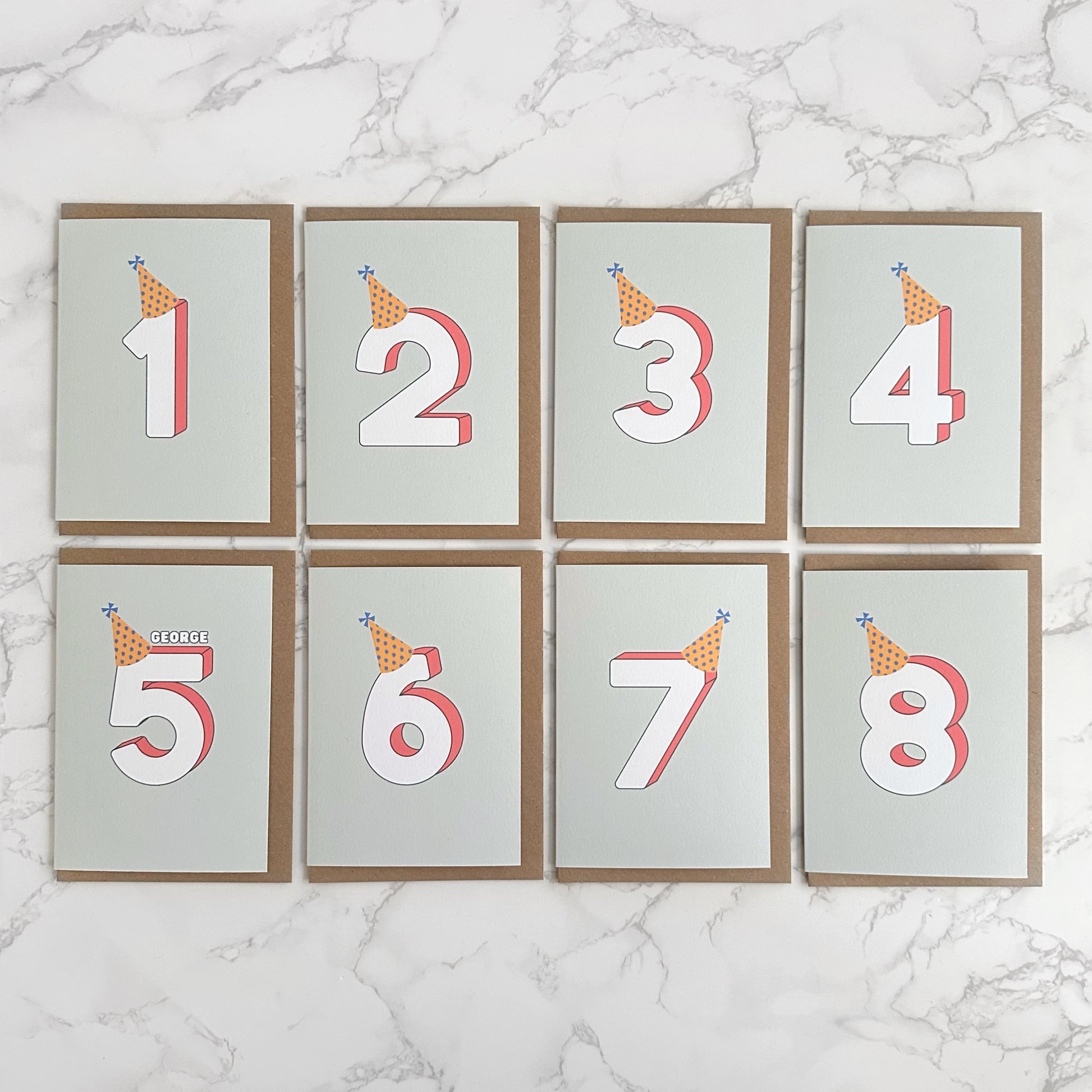 These can be personalised with a name, as seen in the 5th birthday card in the lisiting photos. If you would like the personalisation with a name, please include a note when ordering with the name you'd like on the card. Please note that positioning of the name on the card design will vary, dependant on the length of the name and the age number on the card. Sometimes the name will be curved around the number and sometimes straight along the top or side of the number.