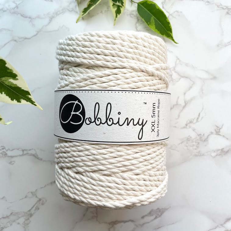 The Bobbiny 5mm 3ply macramé rope is a triple twist cotton cord composed of 120 single threads twisted with three 40-thread parts. It is perfect for macramé, weaving or any fibre arts!