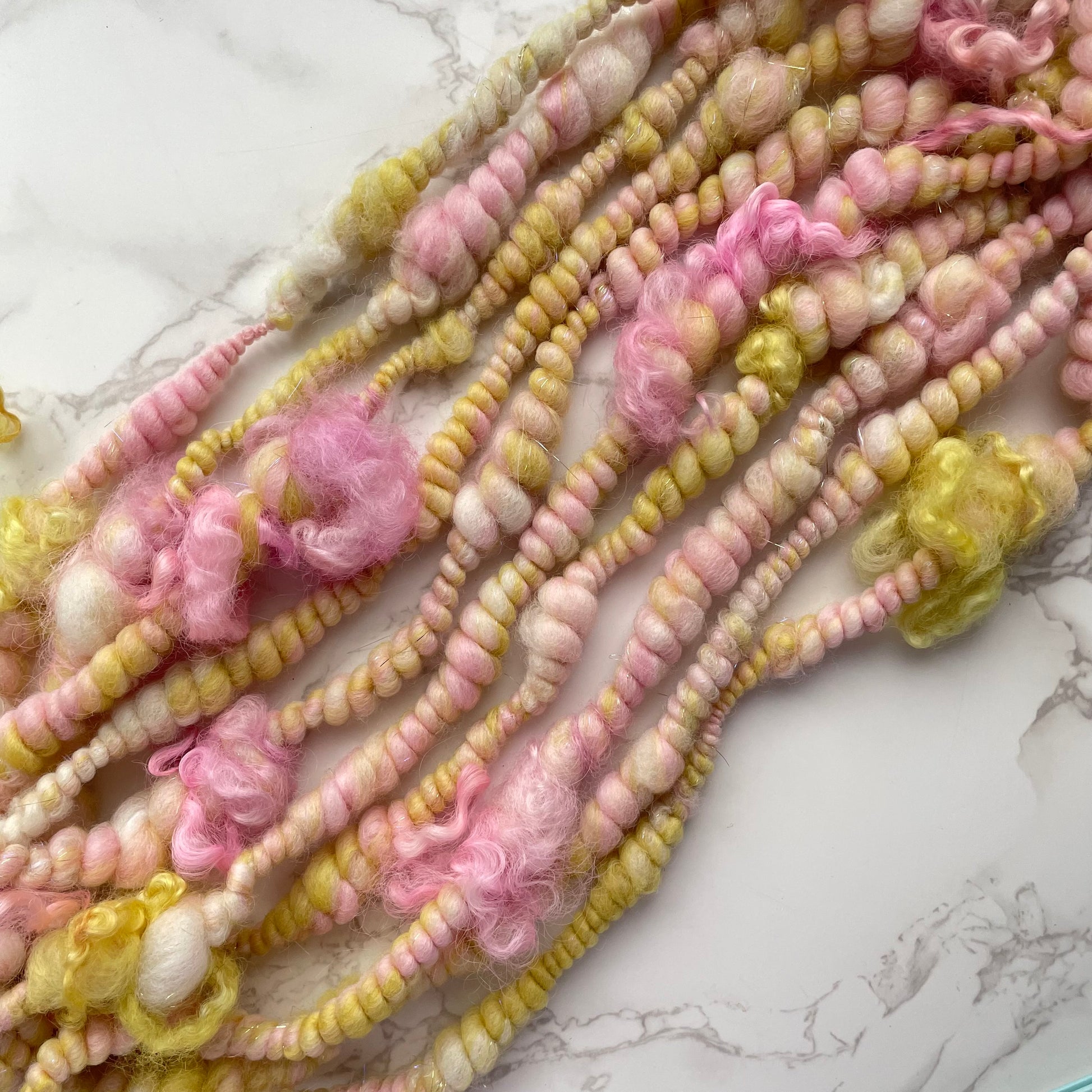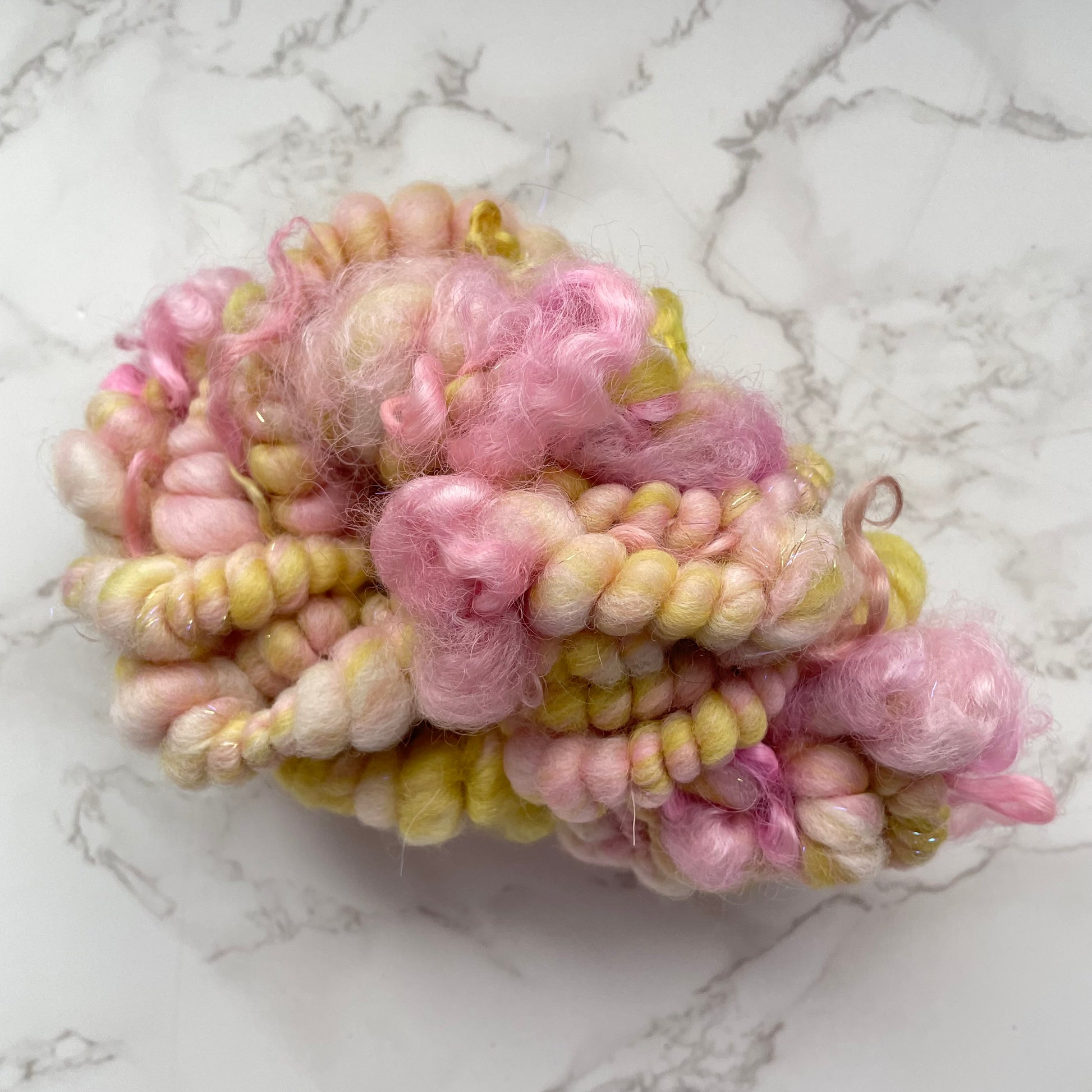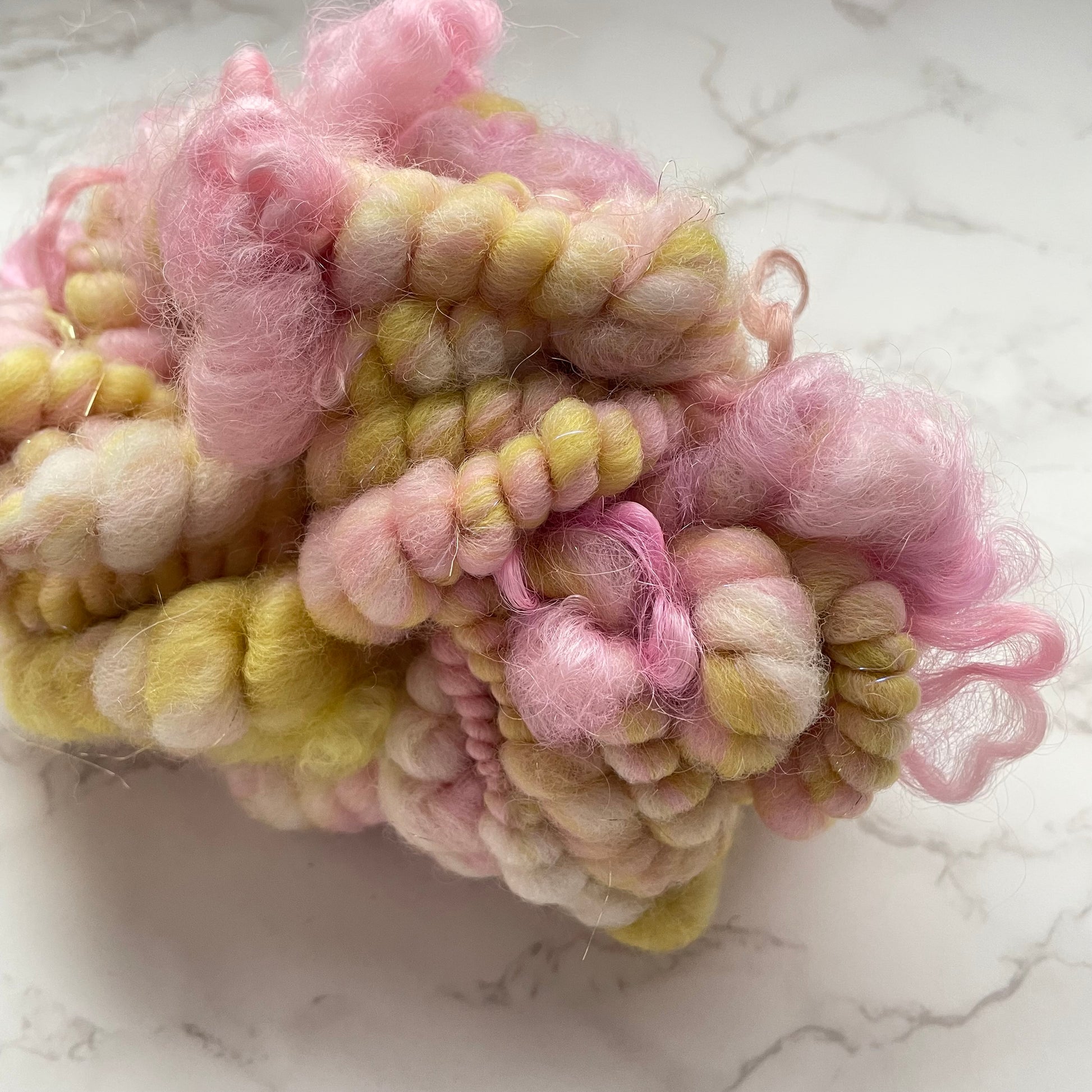 This skein is 74g in weight and approximately 5 yards in length. The fibres have been blended by myself, hand spun on my spinning wheel and then steam set. This yarn is made from mulesing-free merino, glitter fibre and hand dyed Wensleydale locks.