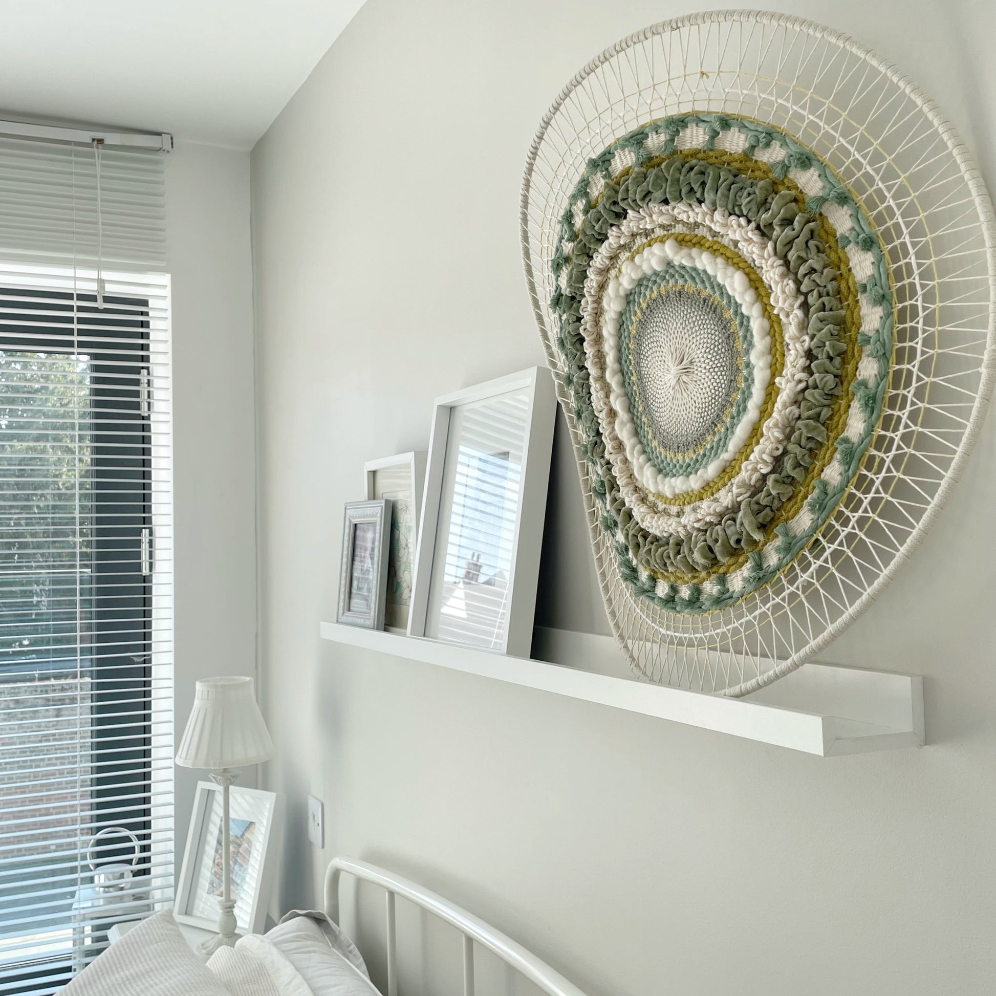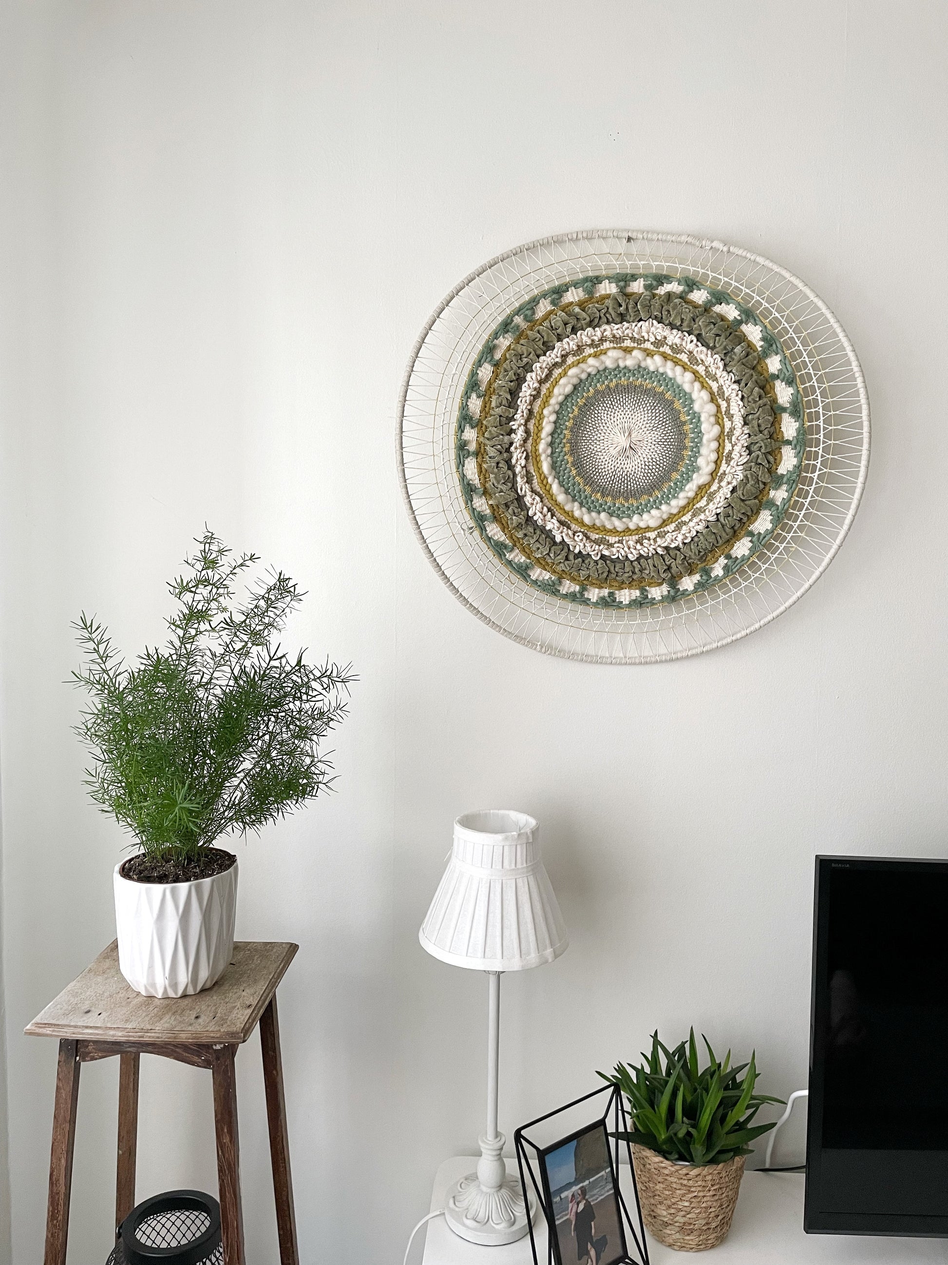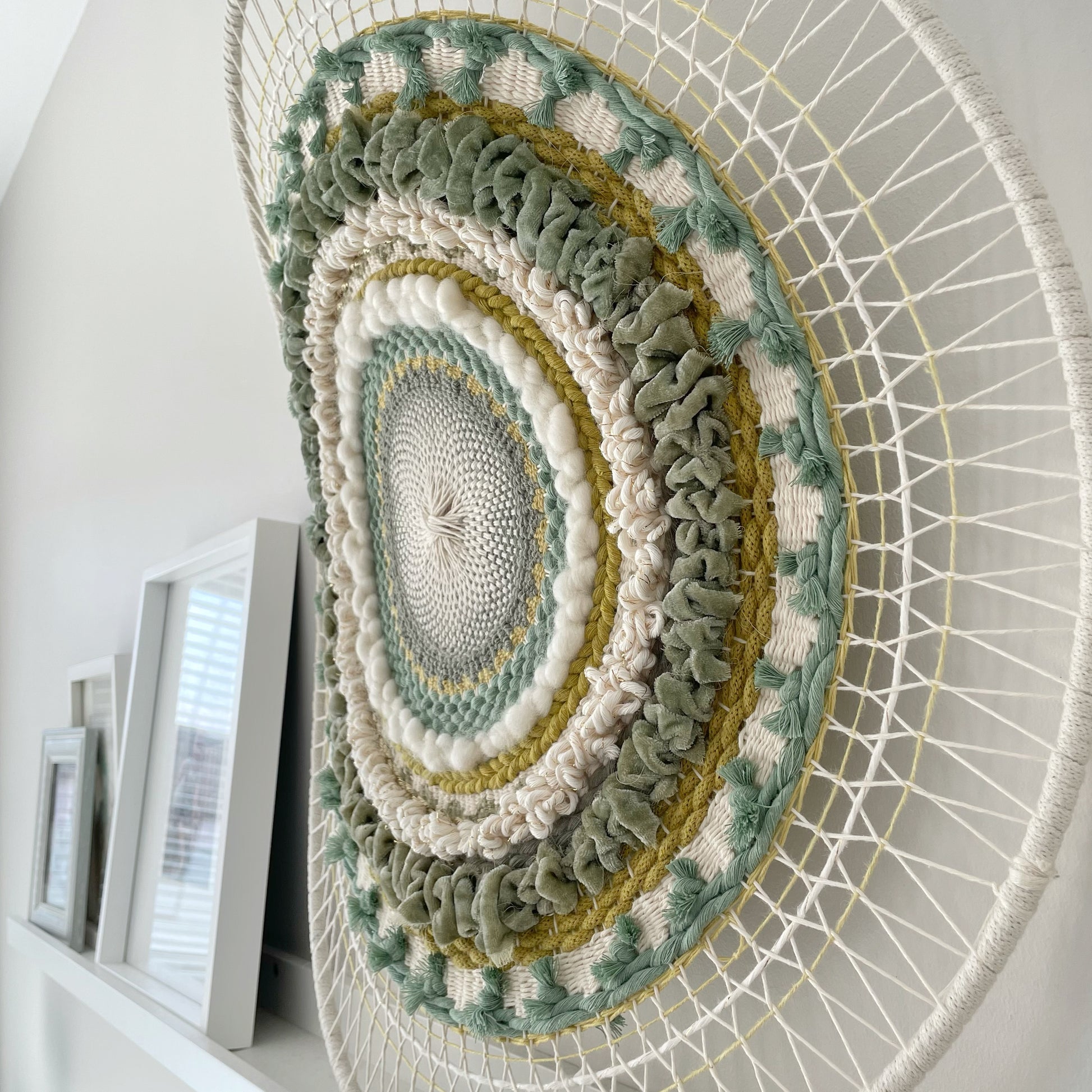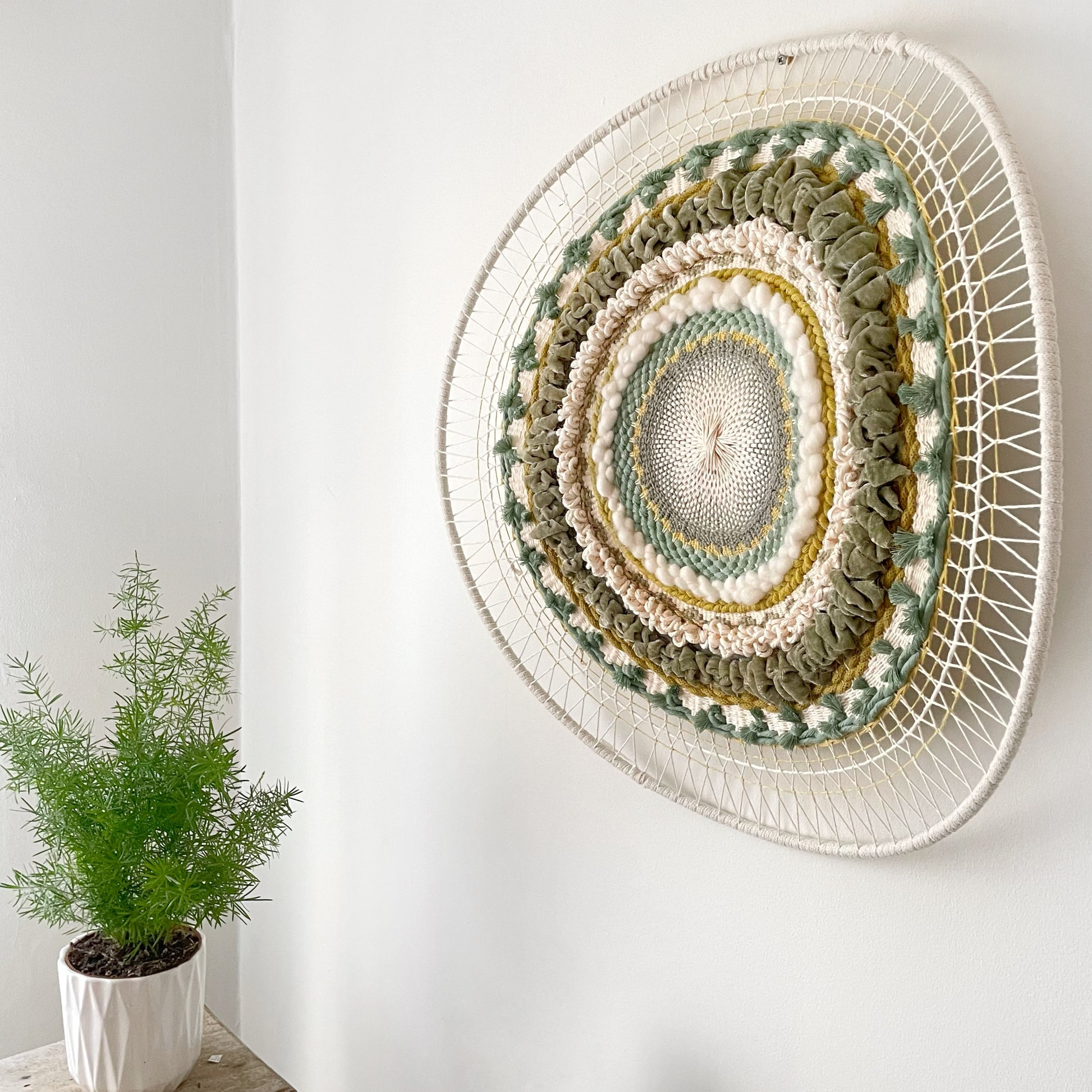 This piece was woven using the high quality fibres. There’s cotton yarn, hand spun merino, velvet ribbon, plant-dyed linen yarn, metallic cord and even more in this piece. It's 23" in diameter with a curvature, so the piece has a super unique look. This took over 20 hours to weave. A beautiful, bold statement piece.