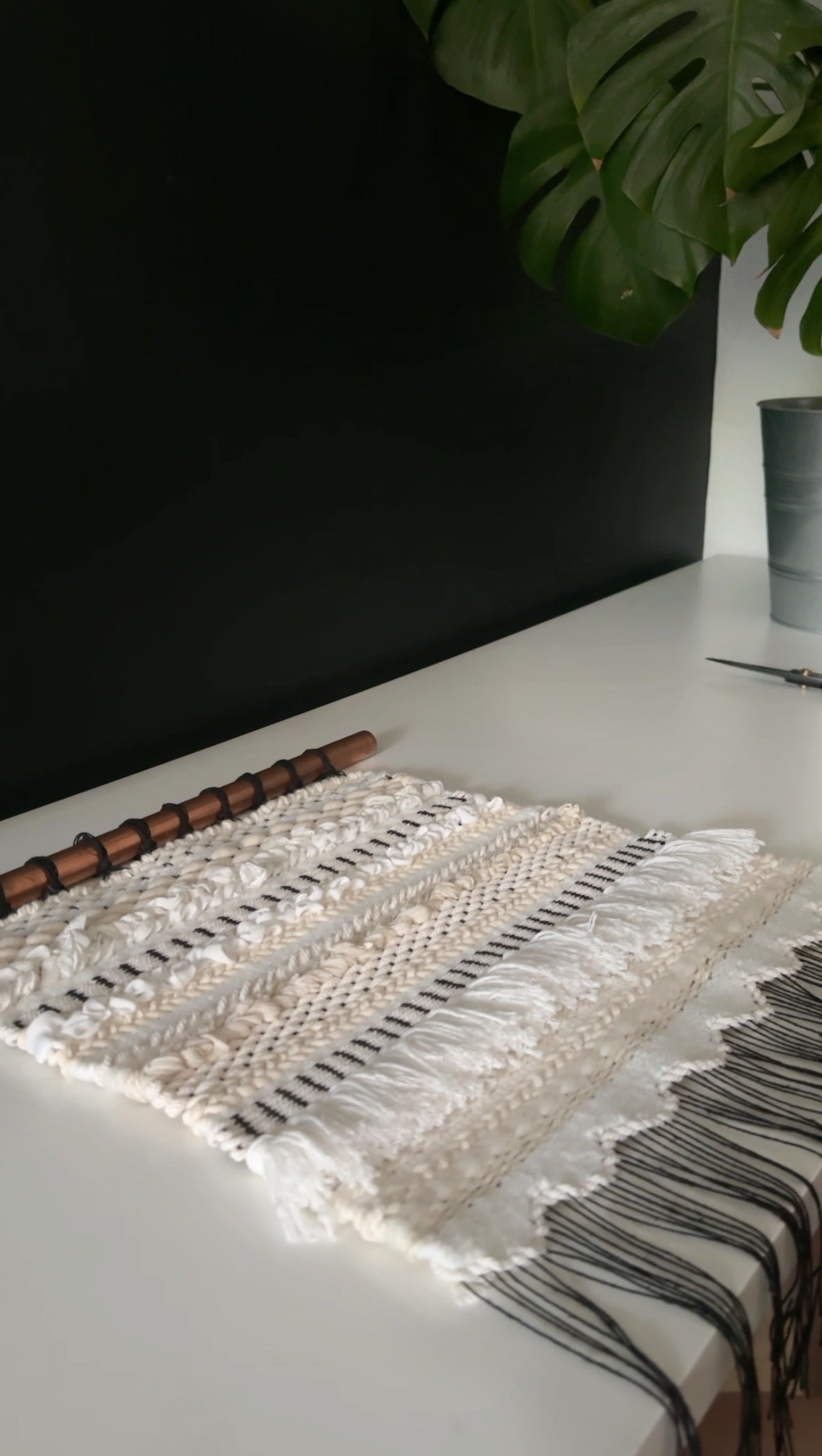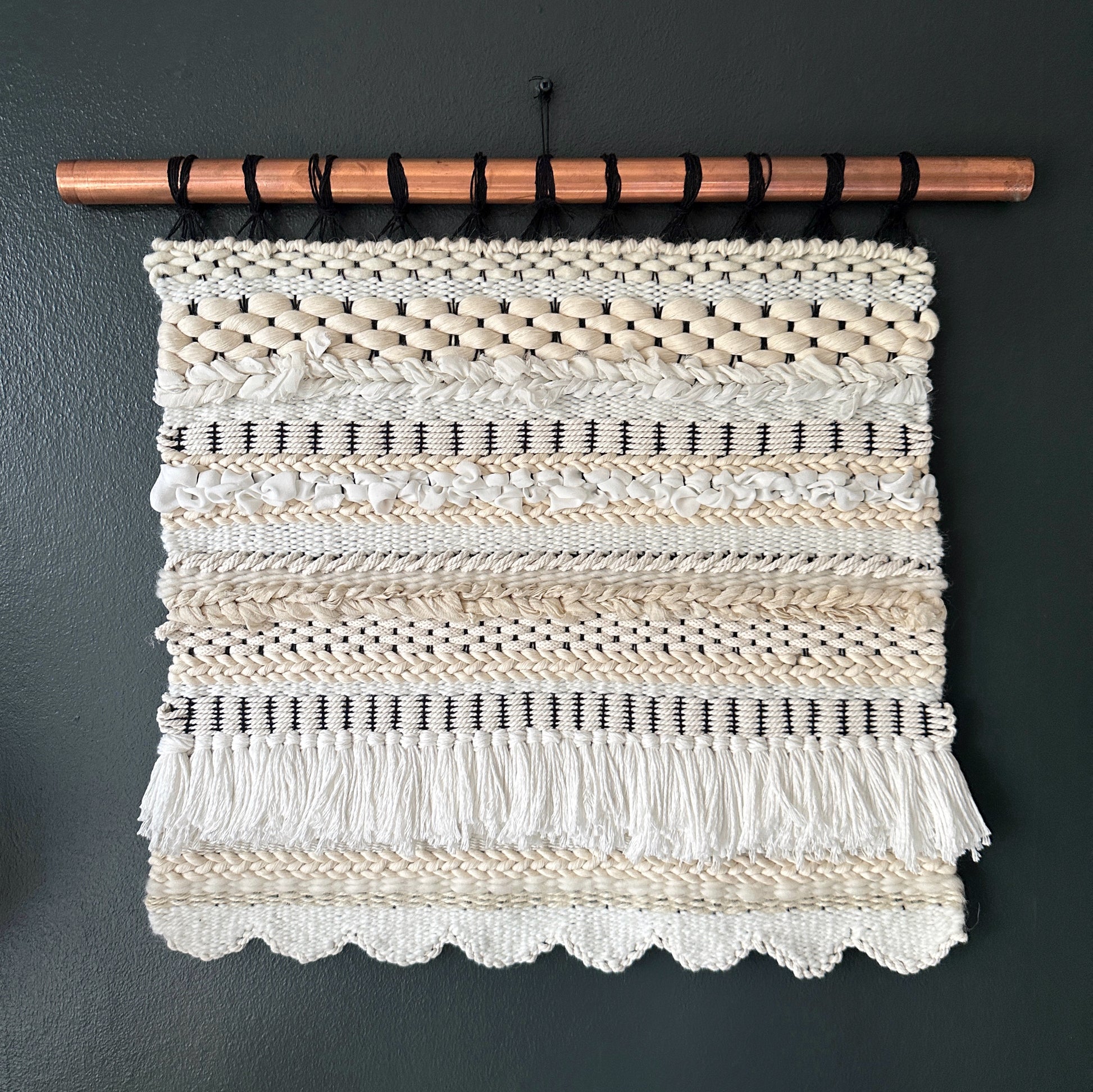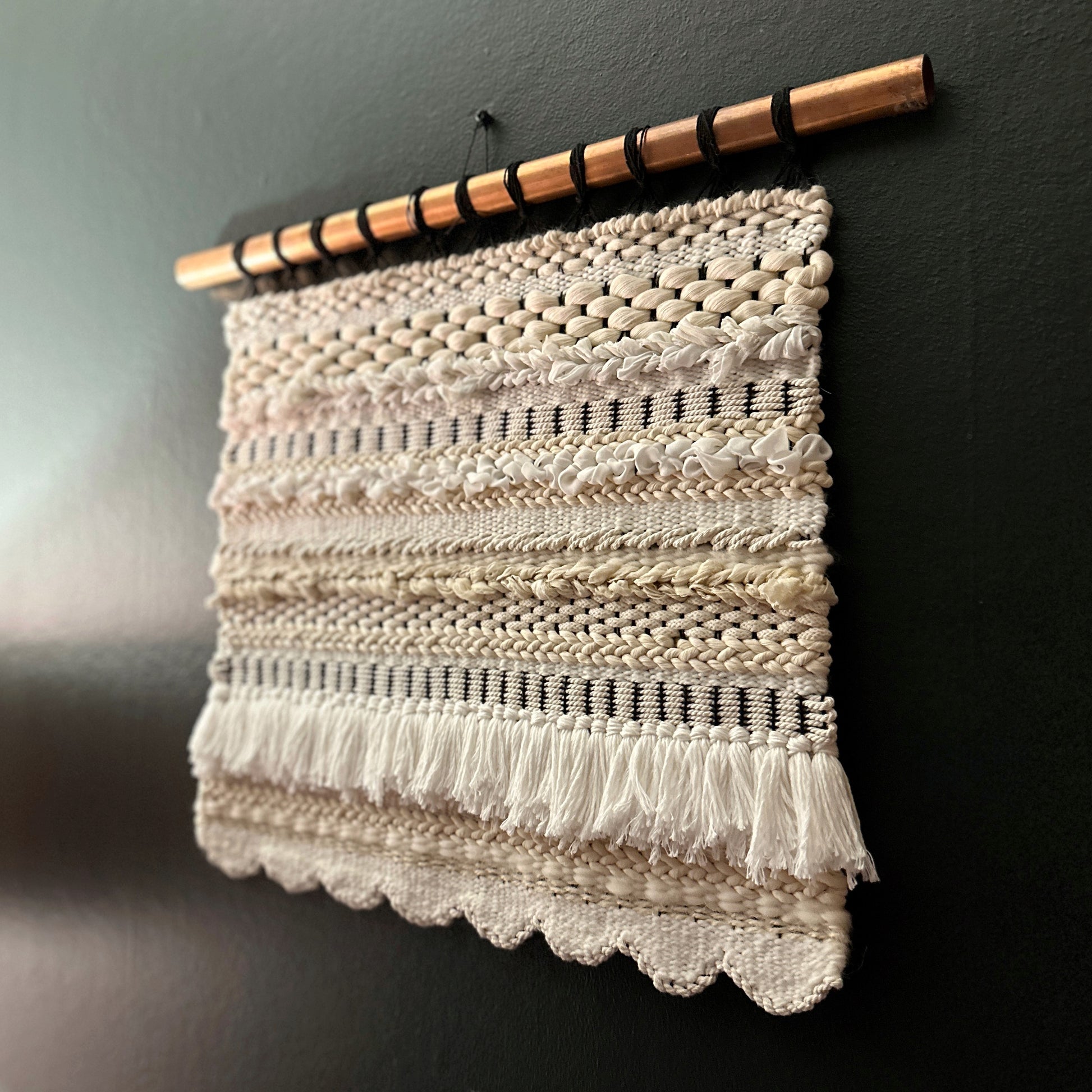 This intricate wall hanging was woven on a frame loom, using beautiful, quality fibres. These include recycled silk chiffon ribbons, recycled cotton and merino wool yarn. If you have any questions at all, please do reach out to me!