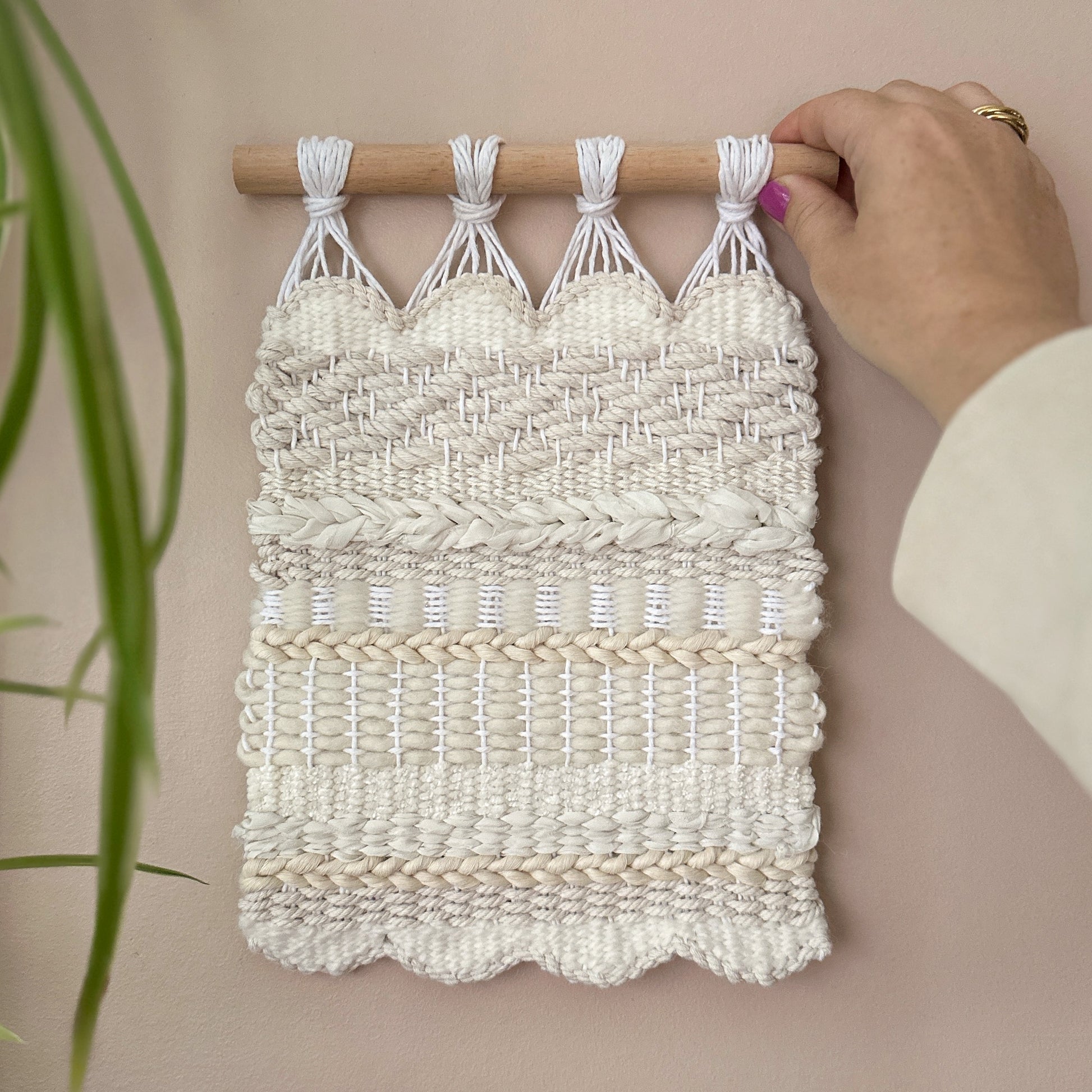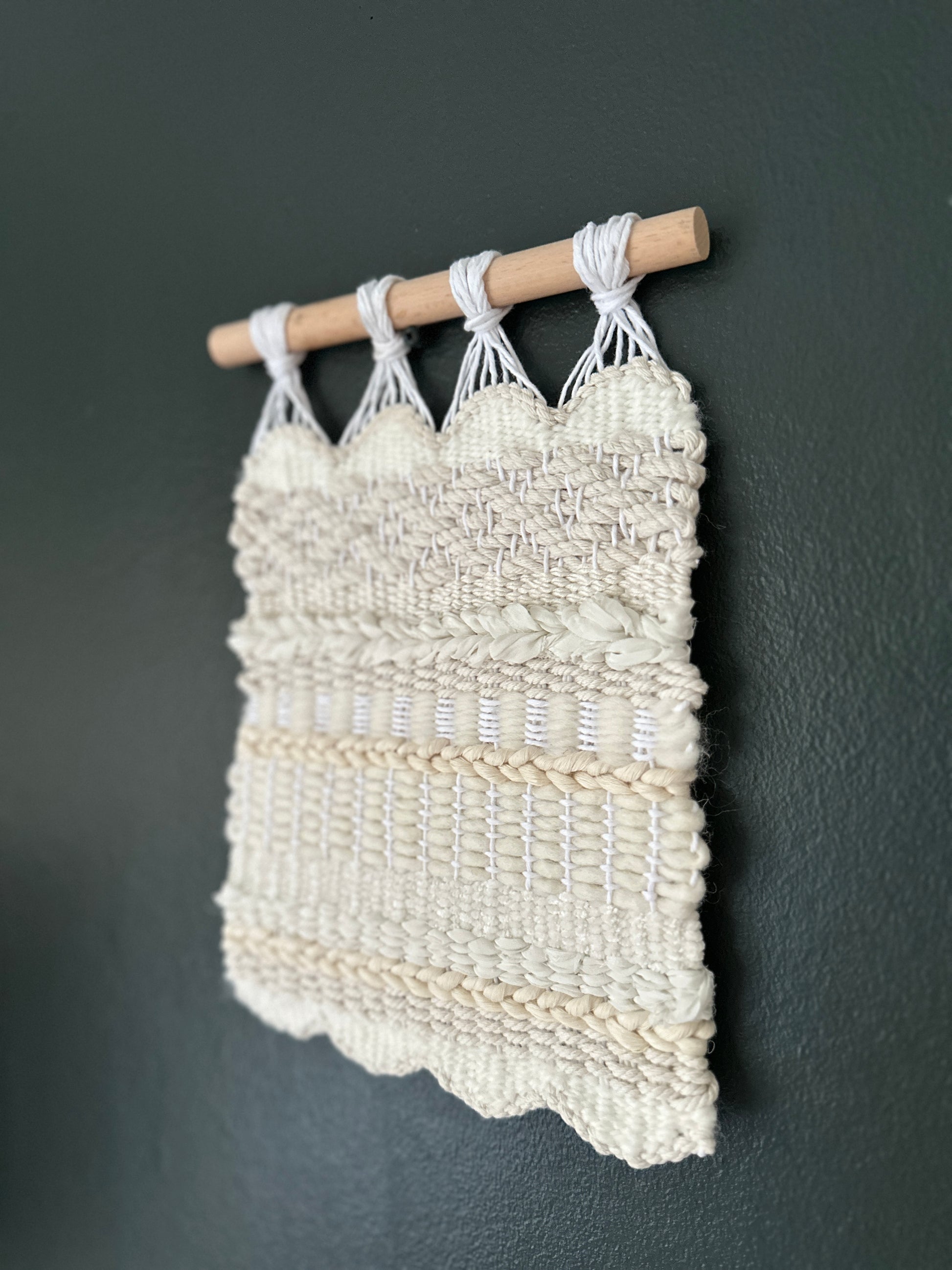 This intricate wall hanging with a scallop edge was woven on a frame loom, which using beautiful, quality fibres. These include recycled silk chiffon ribbons, recycled cotton and merino wool yarn. If you have any questions at all, please do reach out to me!