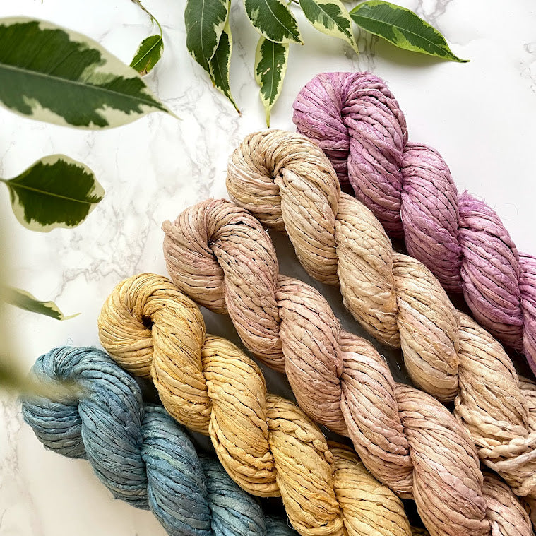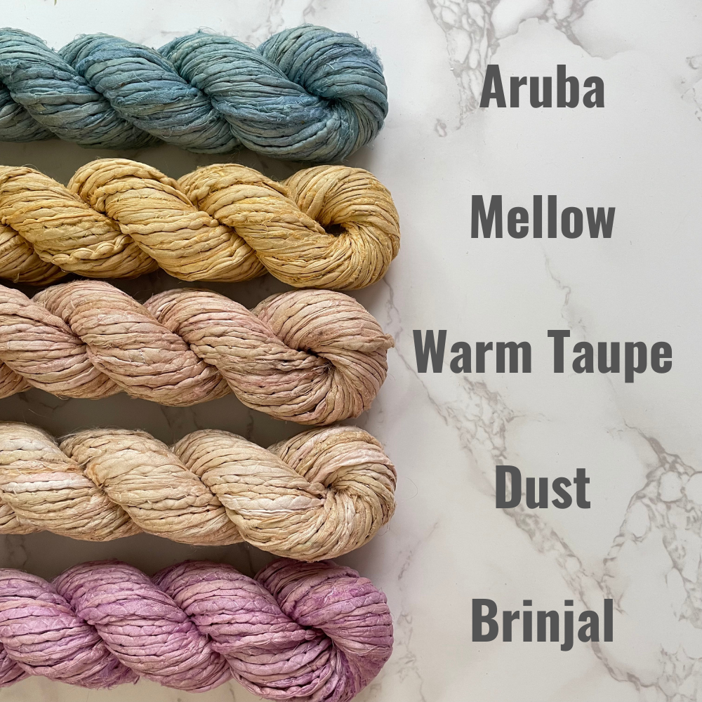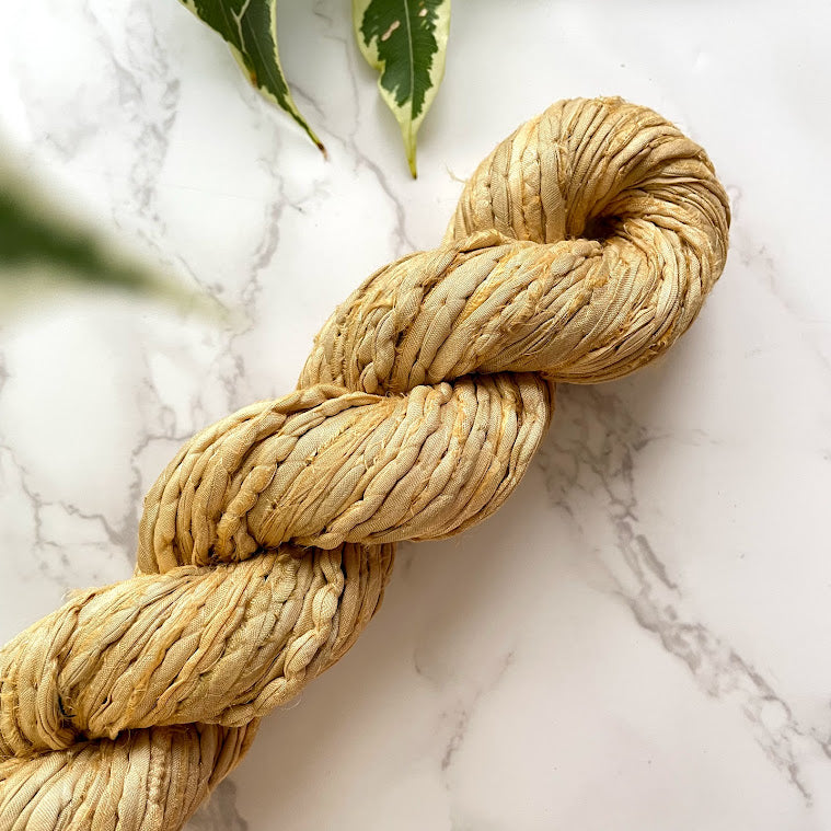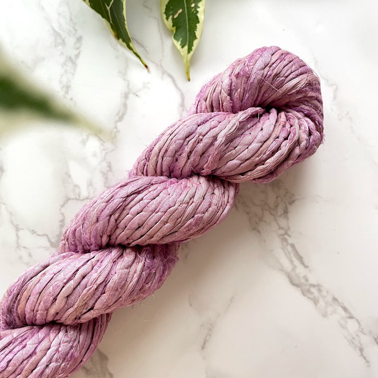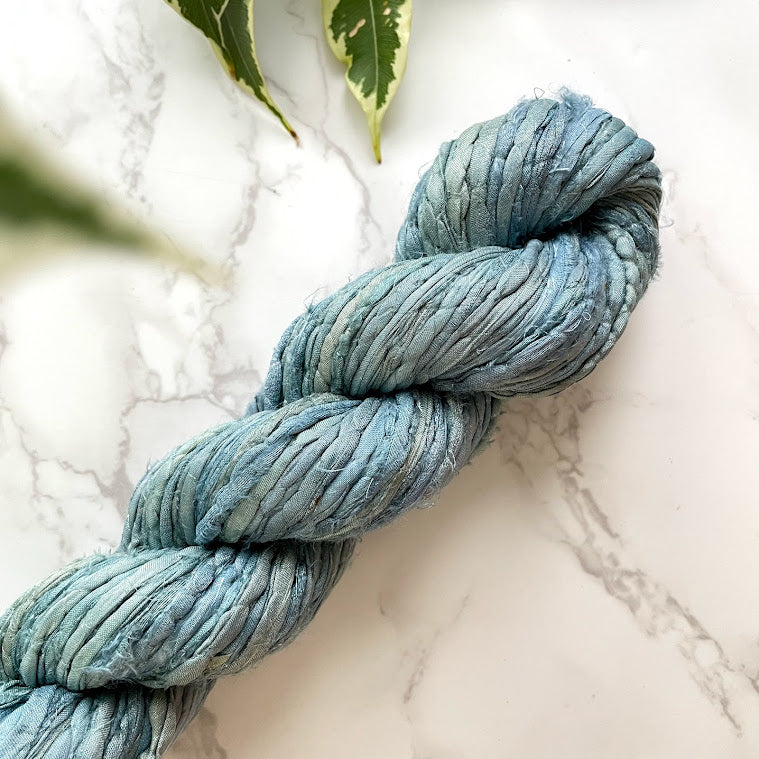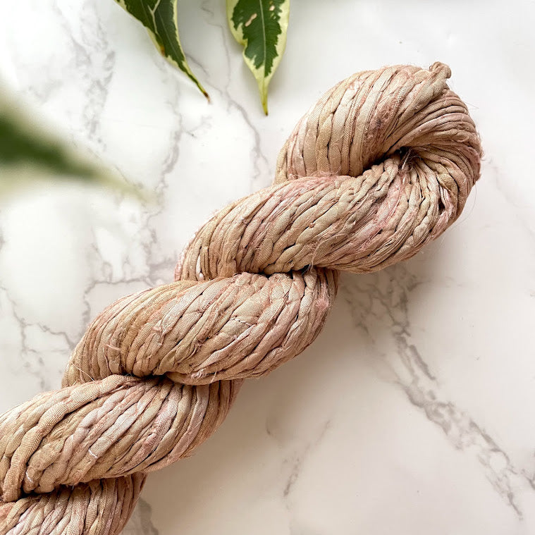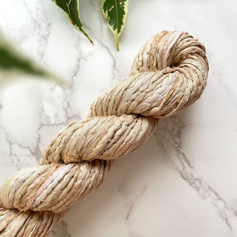 These beautiful skeins of cord are made from recycled sari silk fabric scraps, collected from sari manufacturers in India. Every individual skein is completely unique with its varying colours and patterns. The sari silk fabric is embroidered over to give a lovely effect, which in turn forms a slight stiffness to this cord. The colours vary slightly throughout each skein, which adds to the character and appeal of these recycled fibres! Due to the nature of recycled fabrics and fibres, there are imperfections.