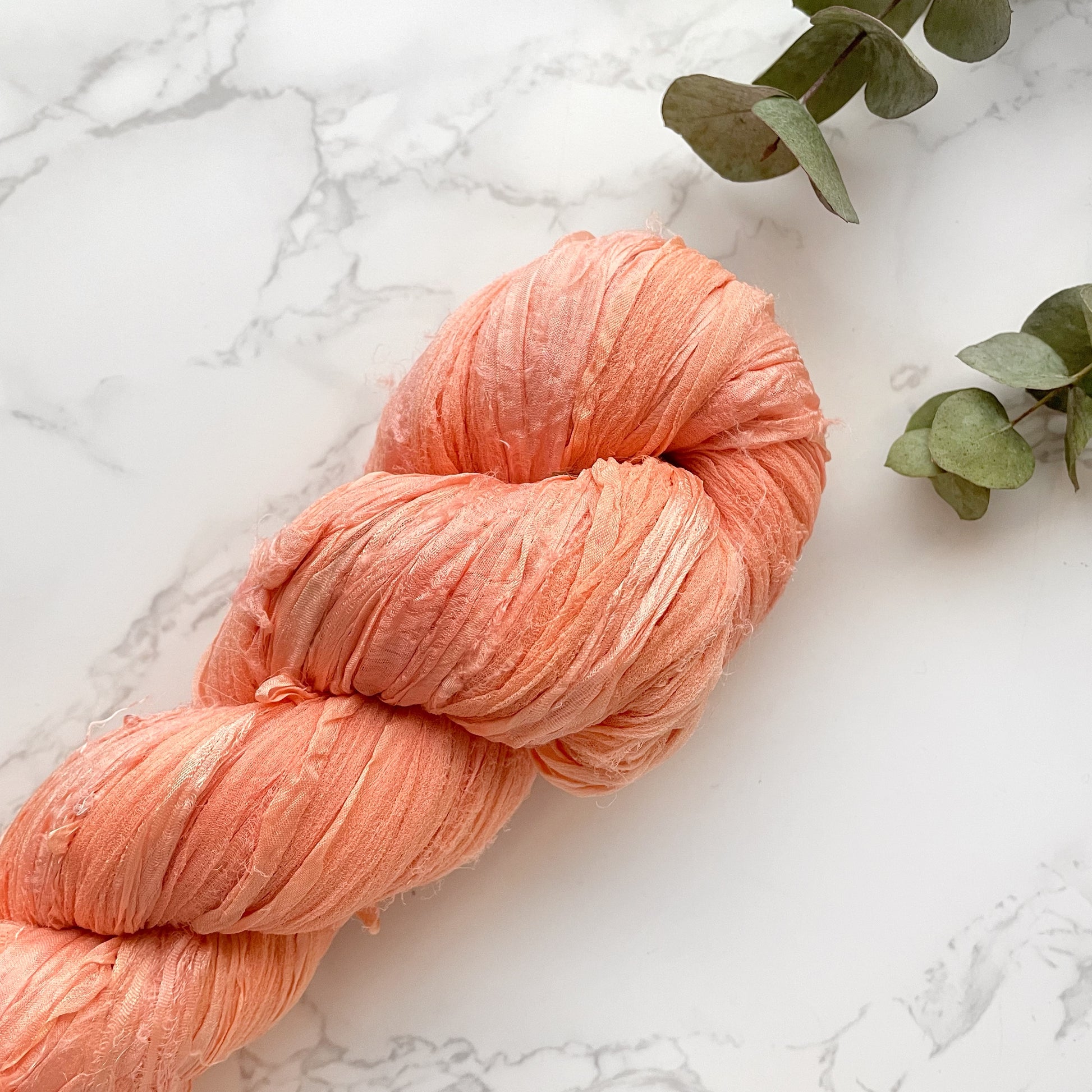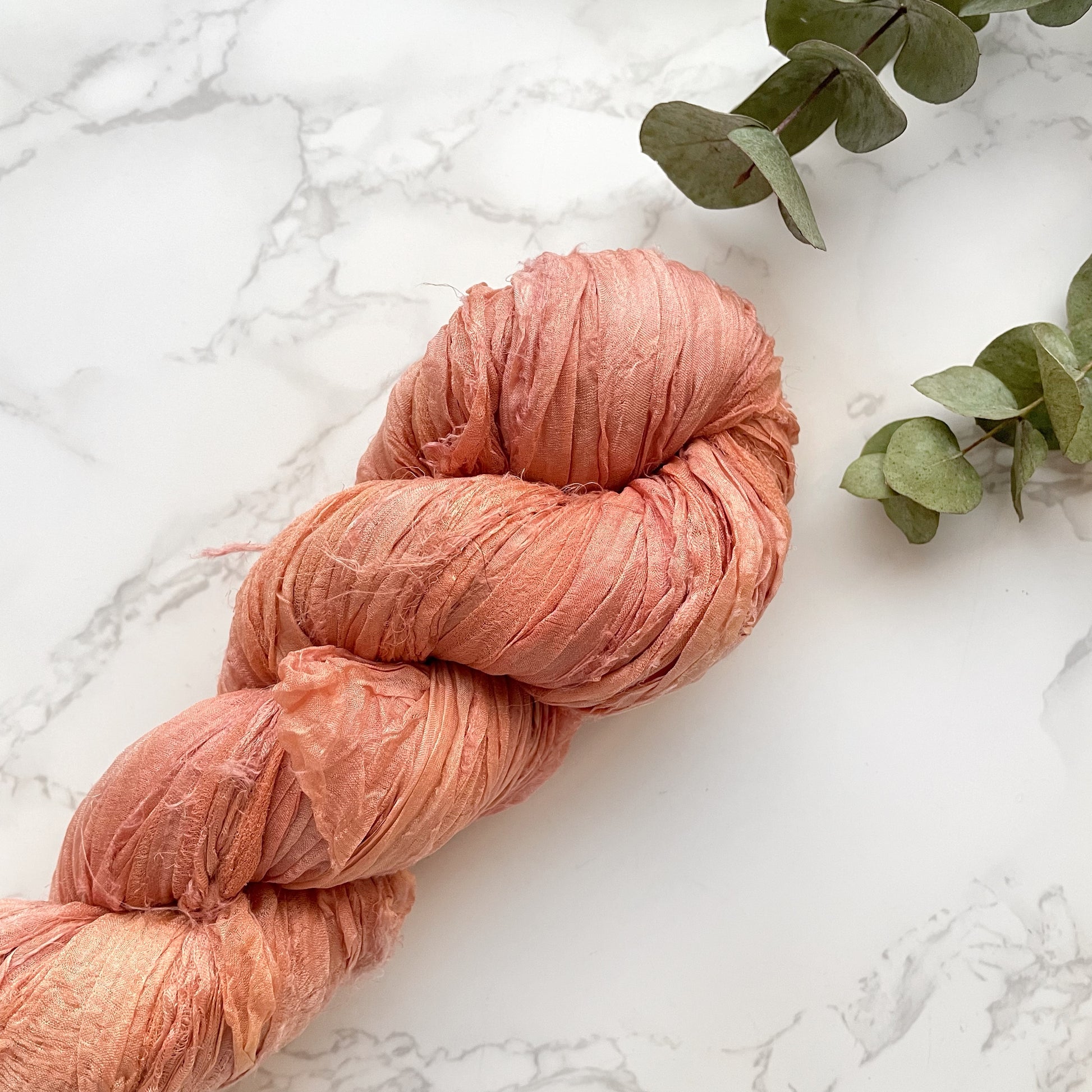 These ribbons are made from recycled silk chiffon waste ends, collected from sari manufacturers in India and 100% recycled. Every individual skein is completely unique with its varying widths, colours and patterns.