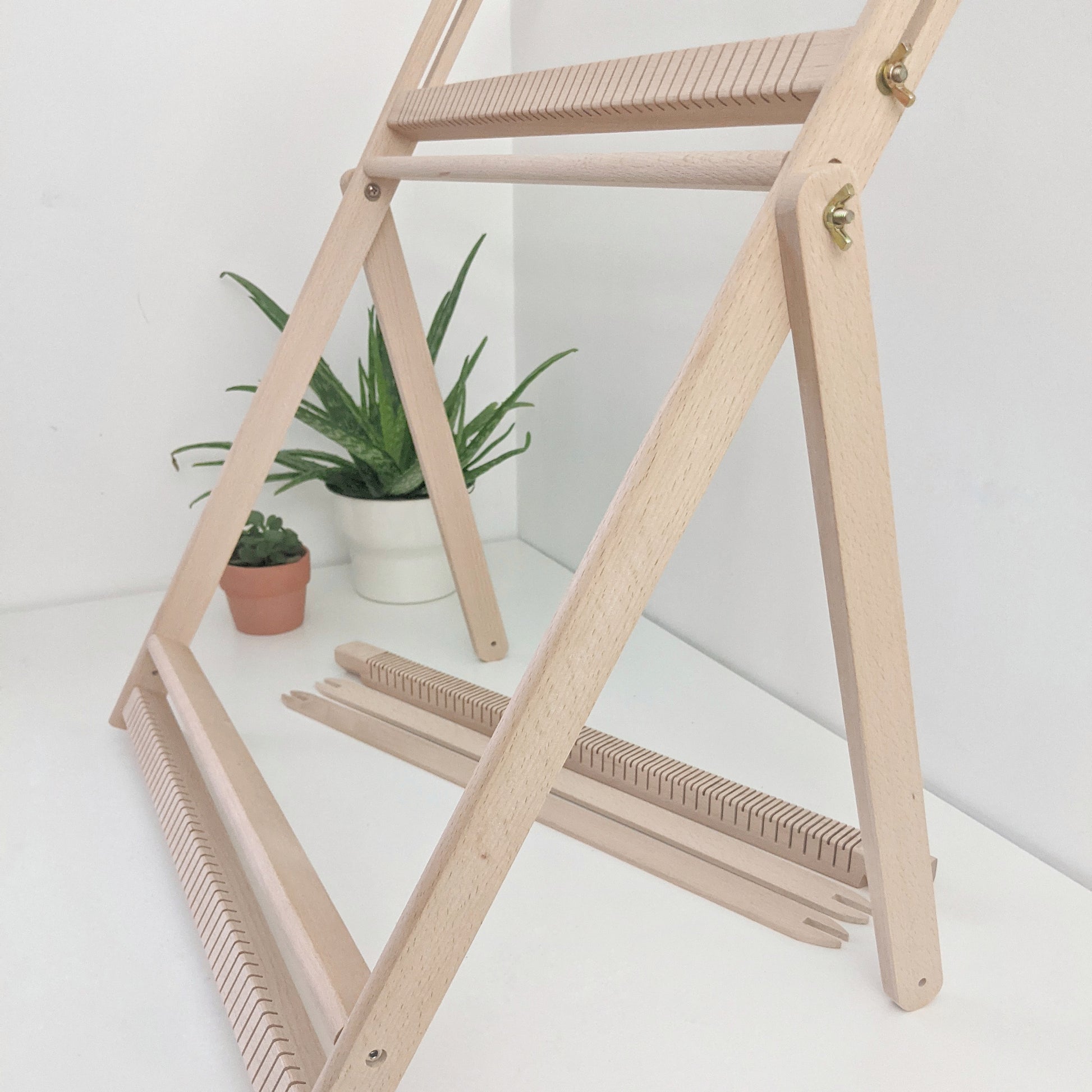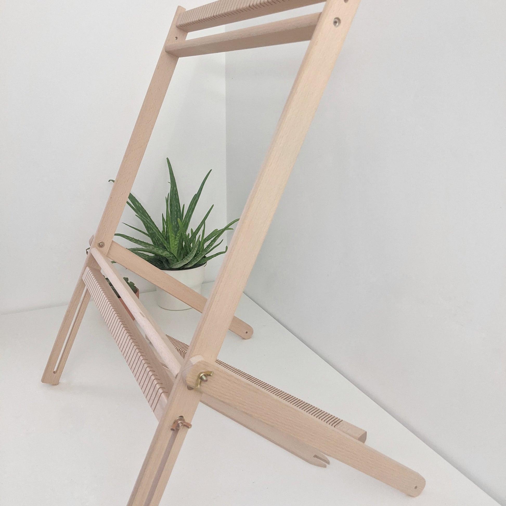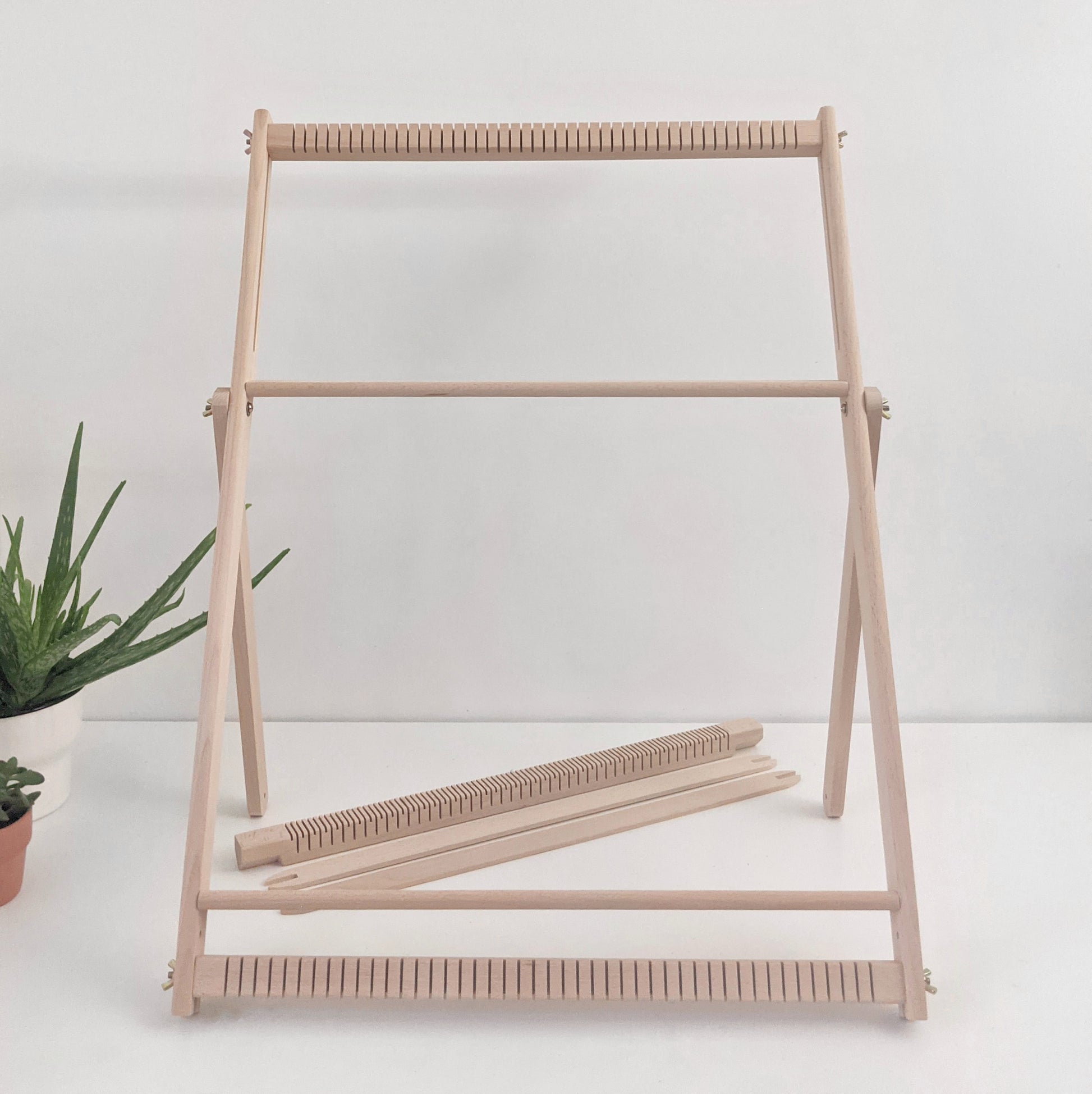 These XL weaving looms have a stand and are 70cm height x 50cm width, with a warp area of approximately 62 height x 44cm width. Both the top and bottom bars of the loom are adjustable, which is ideal for tightening and loosening the tension of the warp when required. The top bar can also be moved higher or lower on the loom, depending on the height that you'd like for your weaving! It's a very user-friendly loom - you can create both small and extra large weavings with this loom!